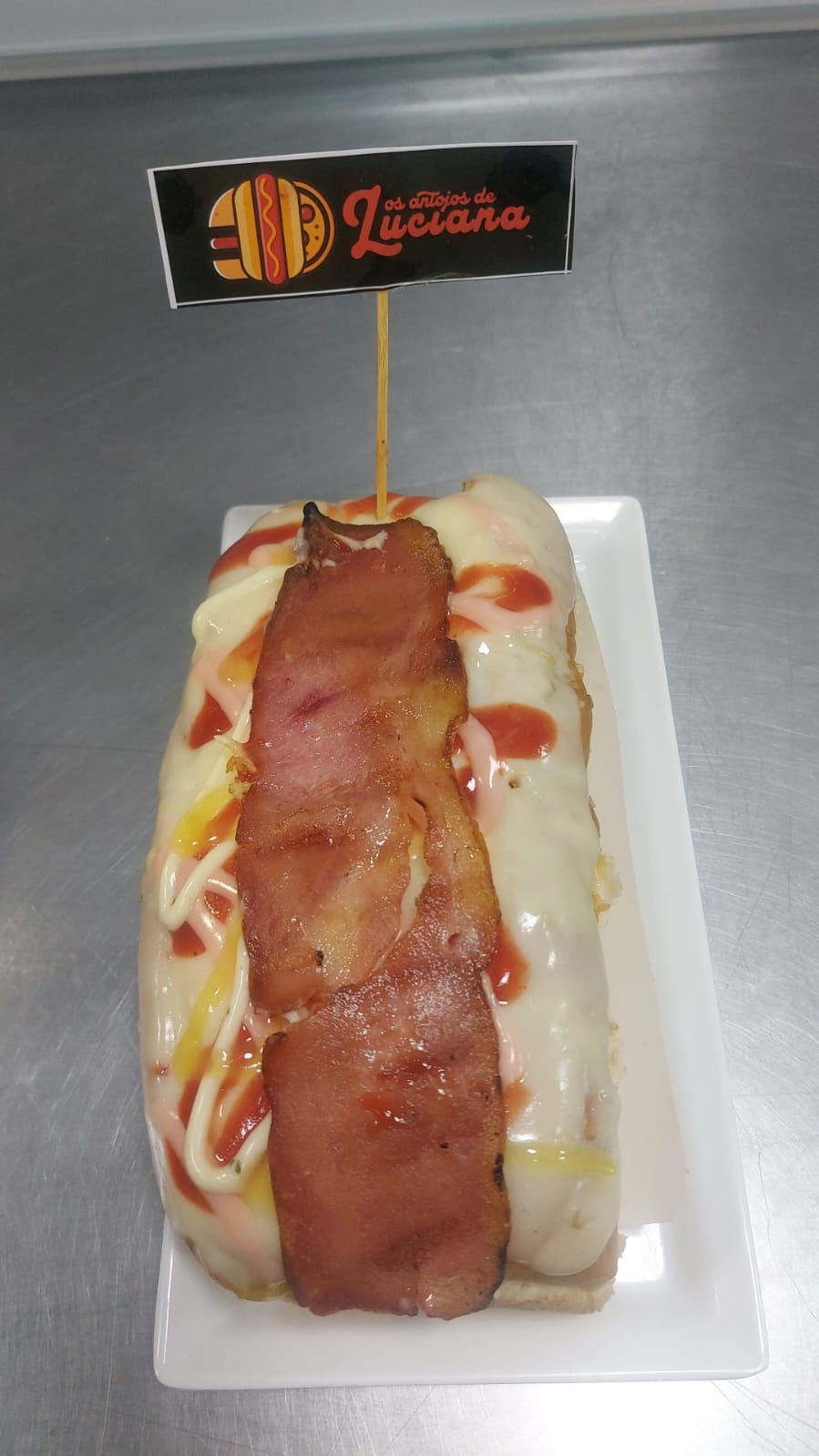 Súper chorineta, chorizo ranchero envuelto en tocineta, pan de perro, queso, cebolla, papas cabello de ángel y salsas de la casa.