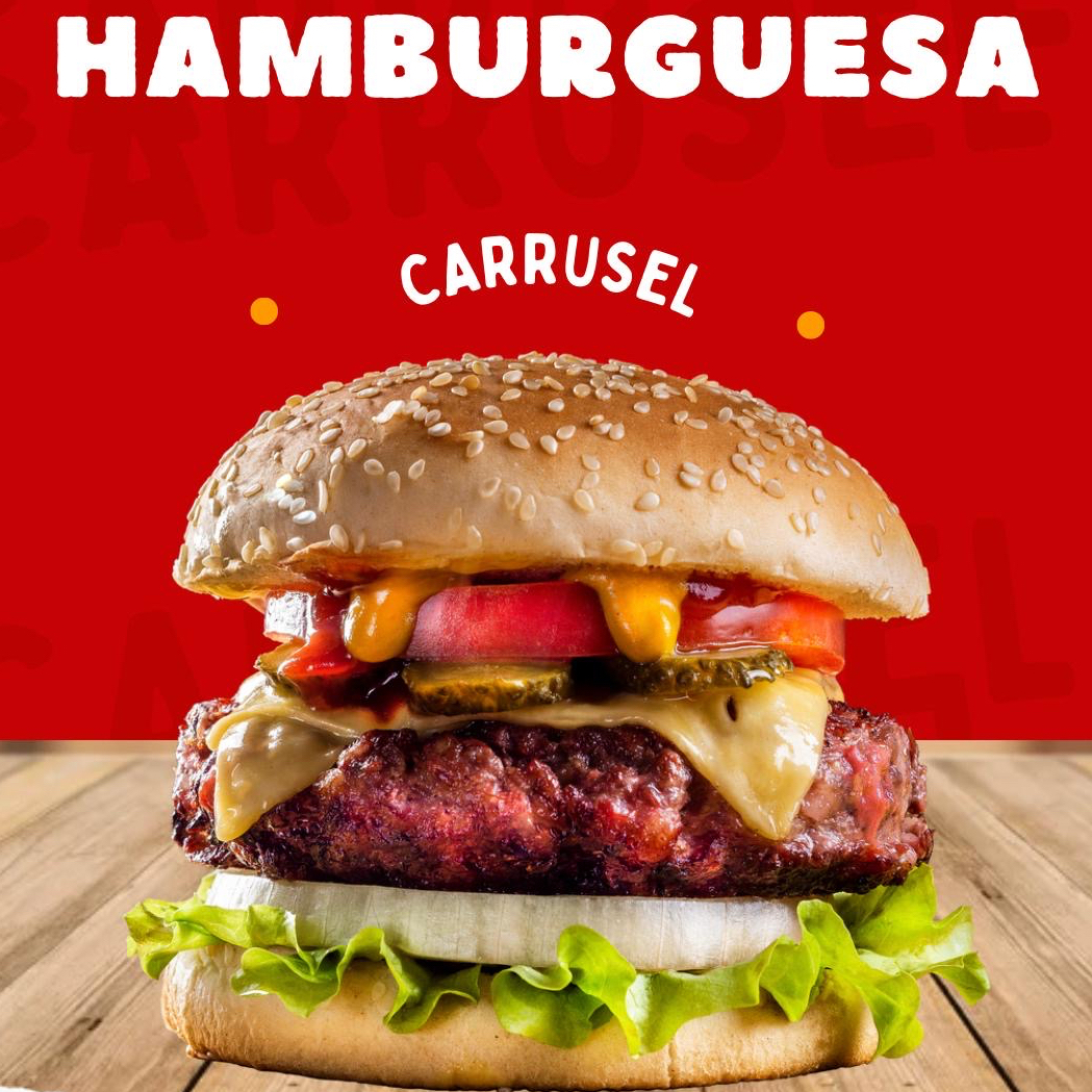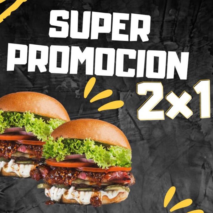 Carne artesanal 220 grs, doble queso, cebolla caramelizada, papa fosforito, ensalada y salsas