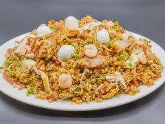 Arroz salteado con camarones, pollo, jamón, carne de cerdo y arroz.