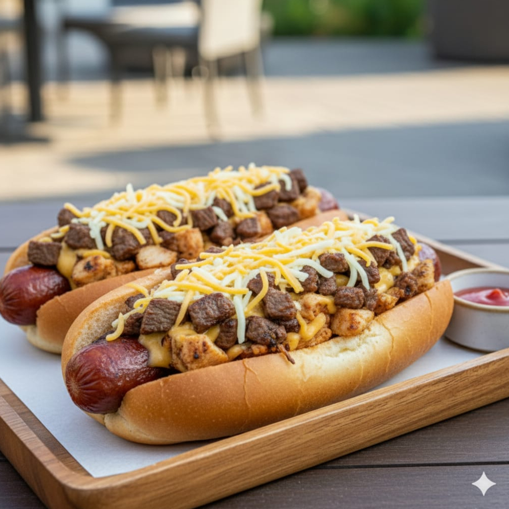 Pan Blandito, Salchichas Americana, Carne y Pollo a la Parrilla Picada En Cubo, Jamón y Queso Amarillo