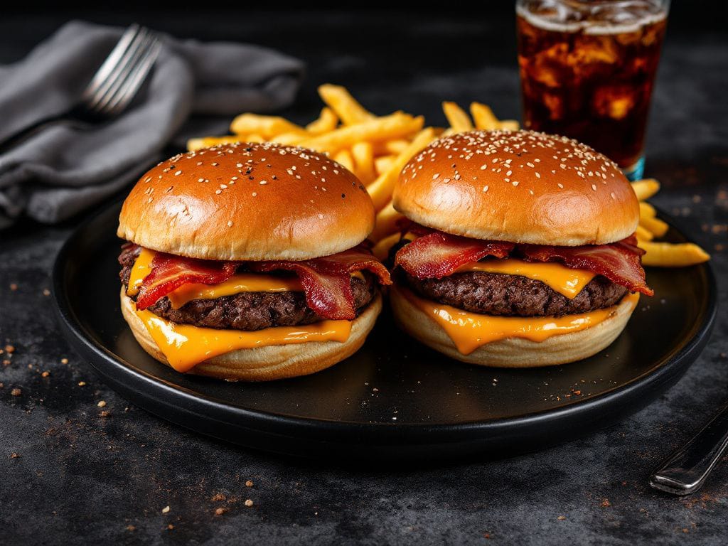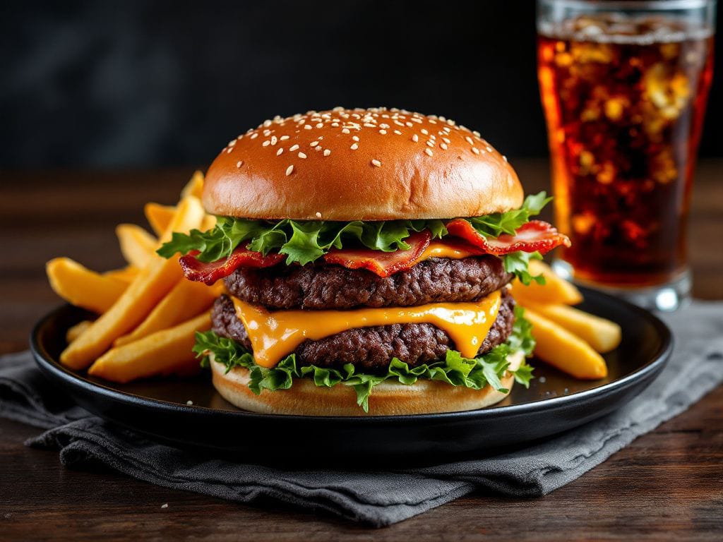 Una experiencia artesanal en cada bocado. Disfruta de 200g de jugosa carne de res artesanal (doble carne) servida en un suave y dorado pan brioche. La complementamos con queso cheddar americano fundido, tocineta crujiente, y una selección de vegetales frescos y nuestras salsas secretas de la casa. Incluye: Crocantes papas a la francesa y tu bebida favorita