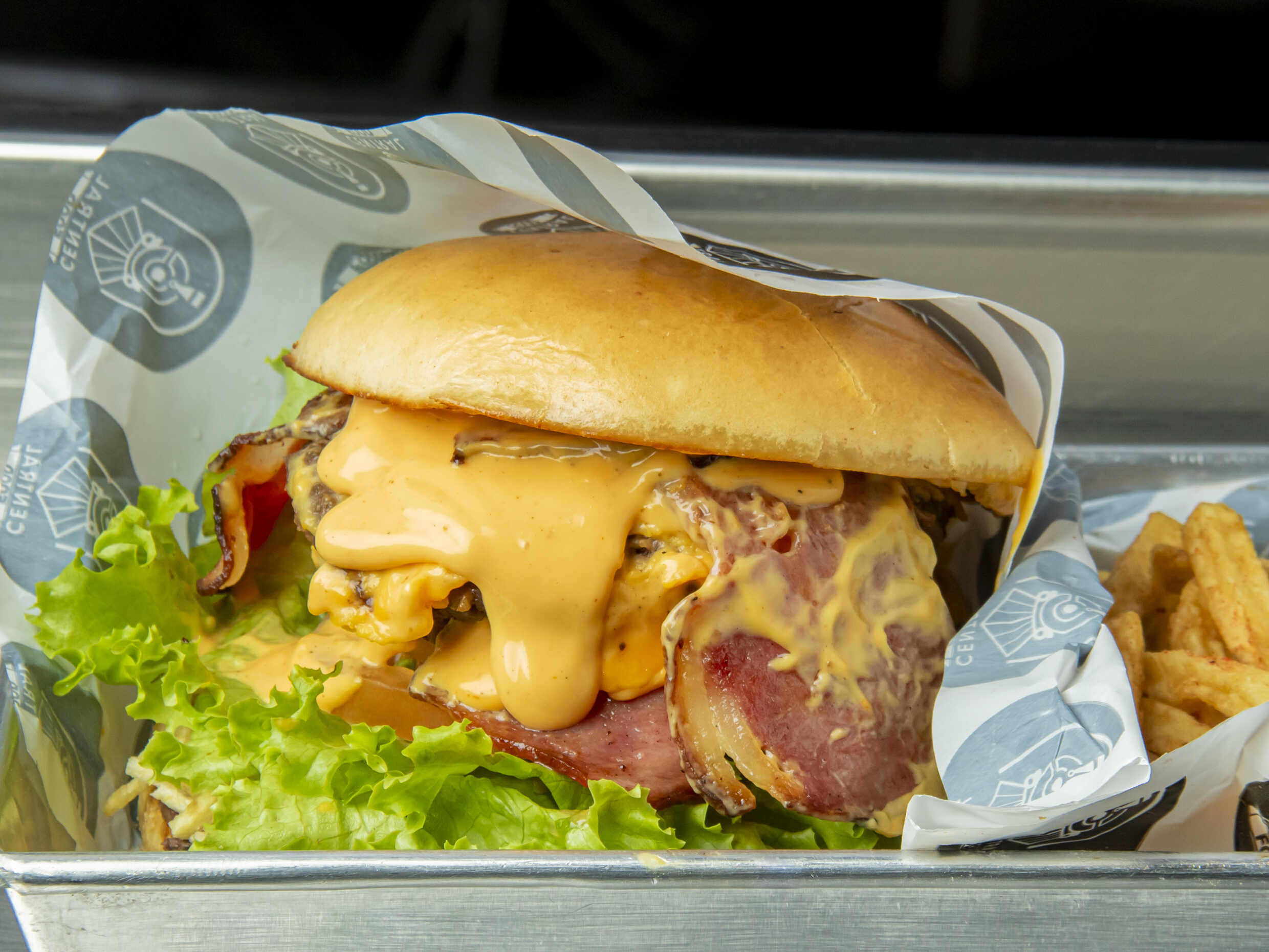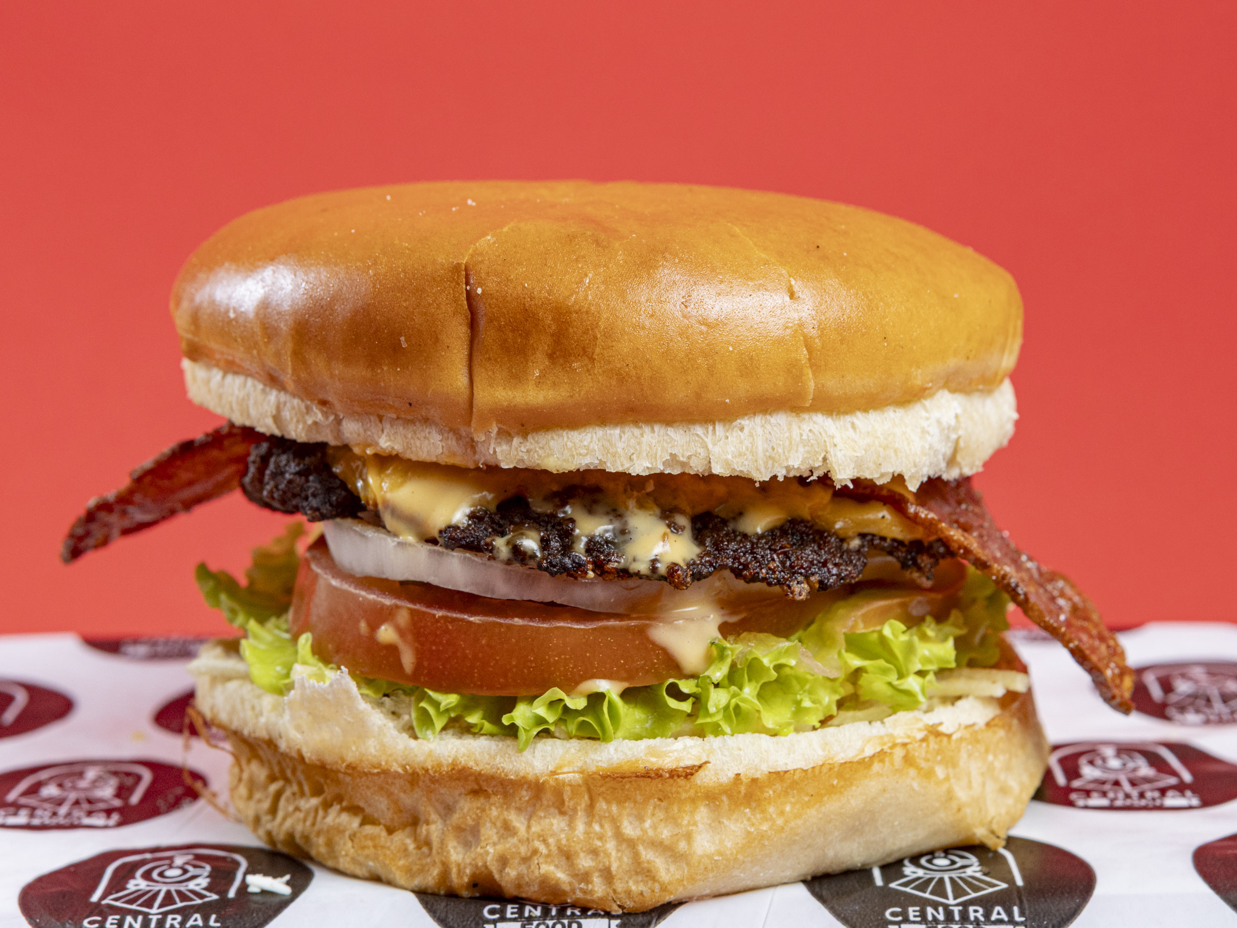 carne 100% de res, tocineta, queso cheddar, vegetales como tomate, cebolla, lechuga, salsa de tomate, mayonesa, tartara.
