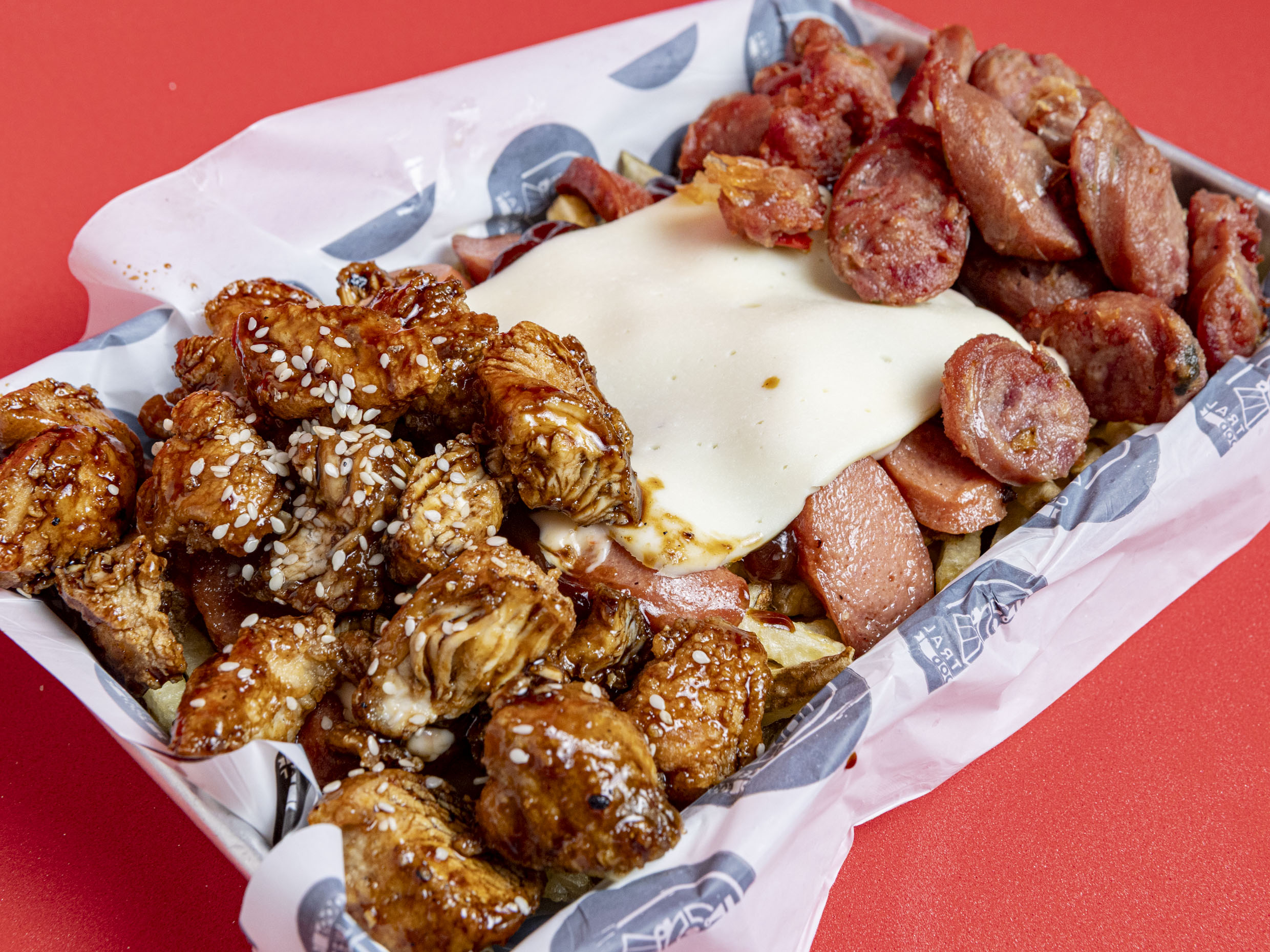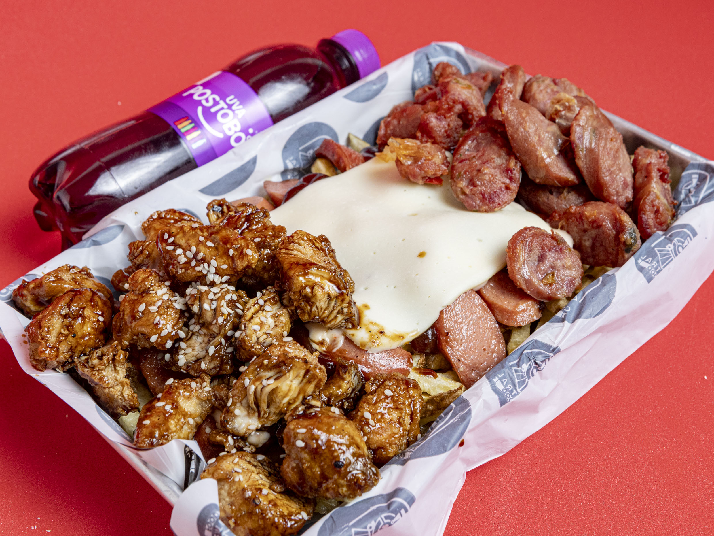 Papa francesa artesanal con salchicha, acompañada de queso mozzarella derretido y dos proteinas.