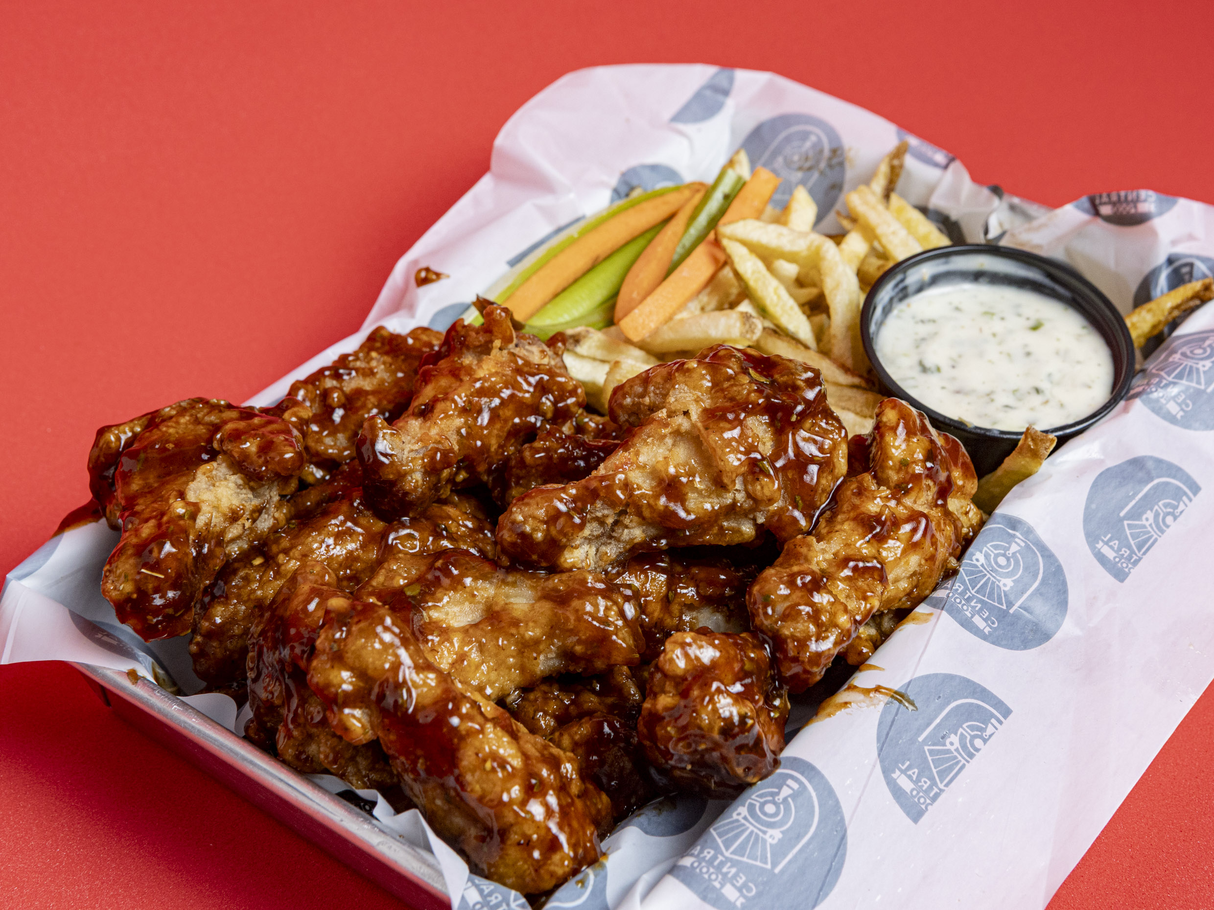 20 Piezas de alas de pollo en salsa a elección , acompañados con papas francesas. + gaseosa