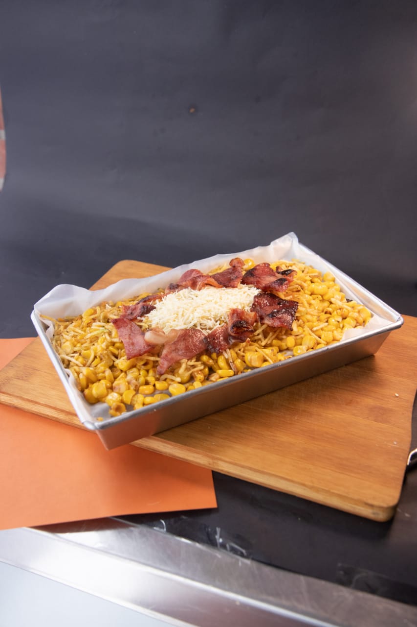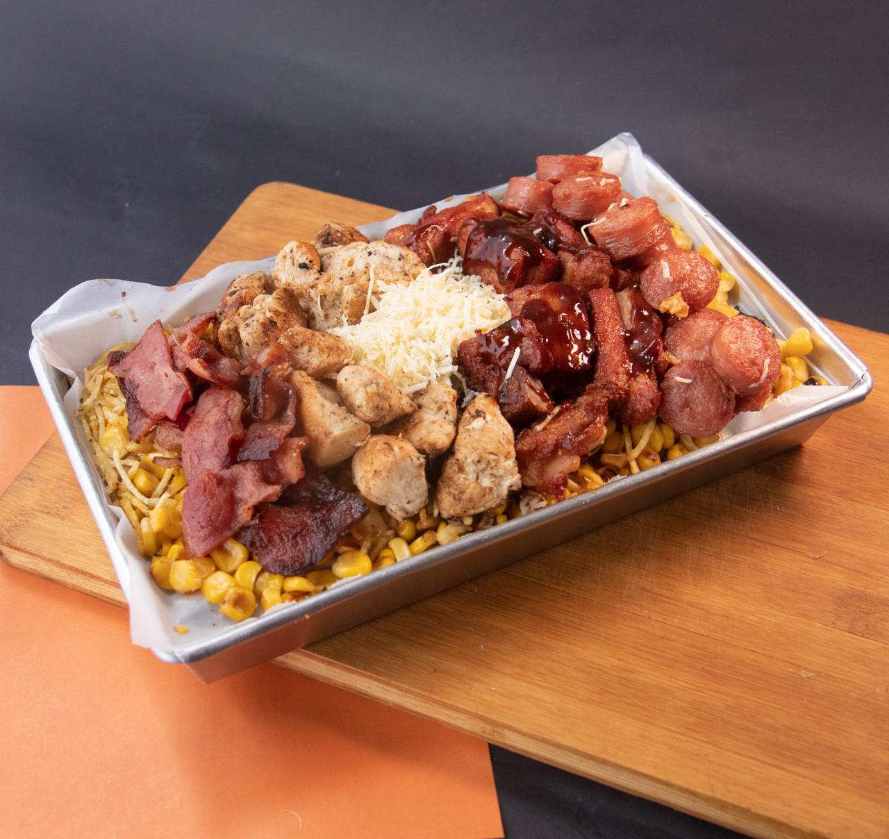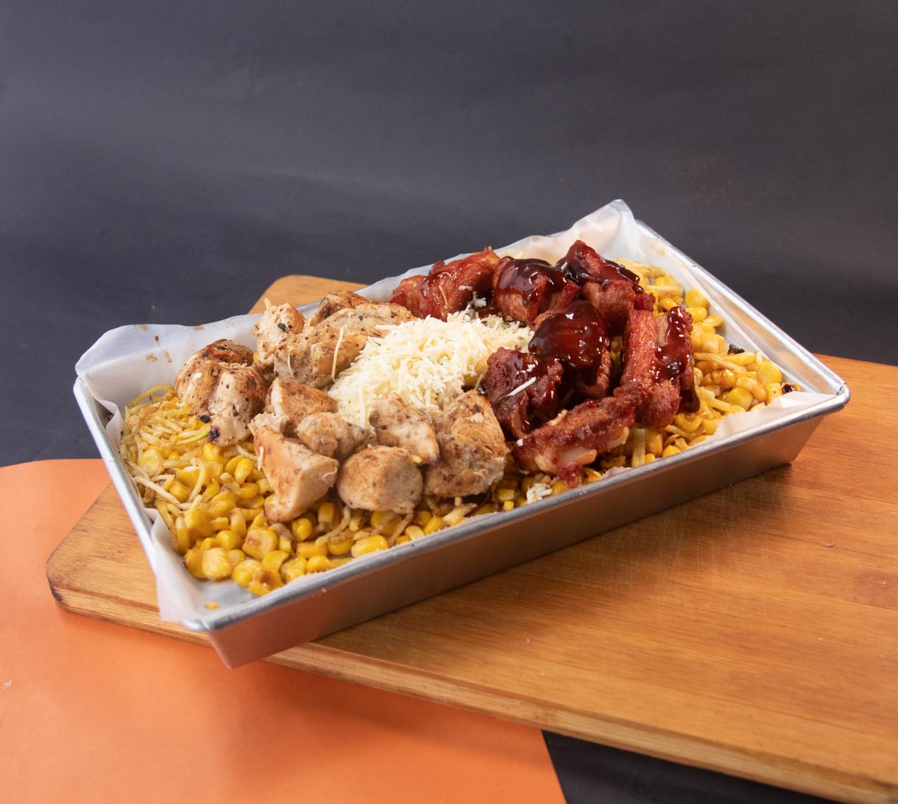 170g De maíz, queso costeño, pollo, costilla, chorizo, salsa como mayonesa, tartara, bufalo y papas chips.