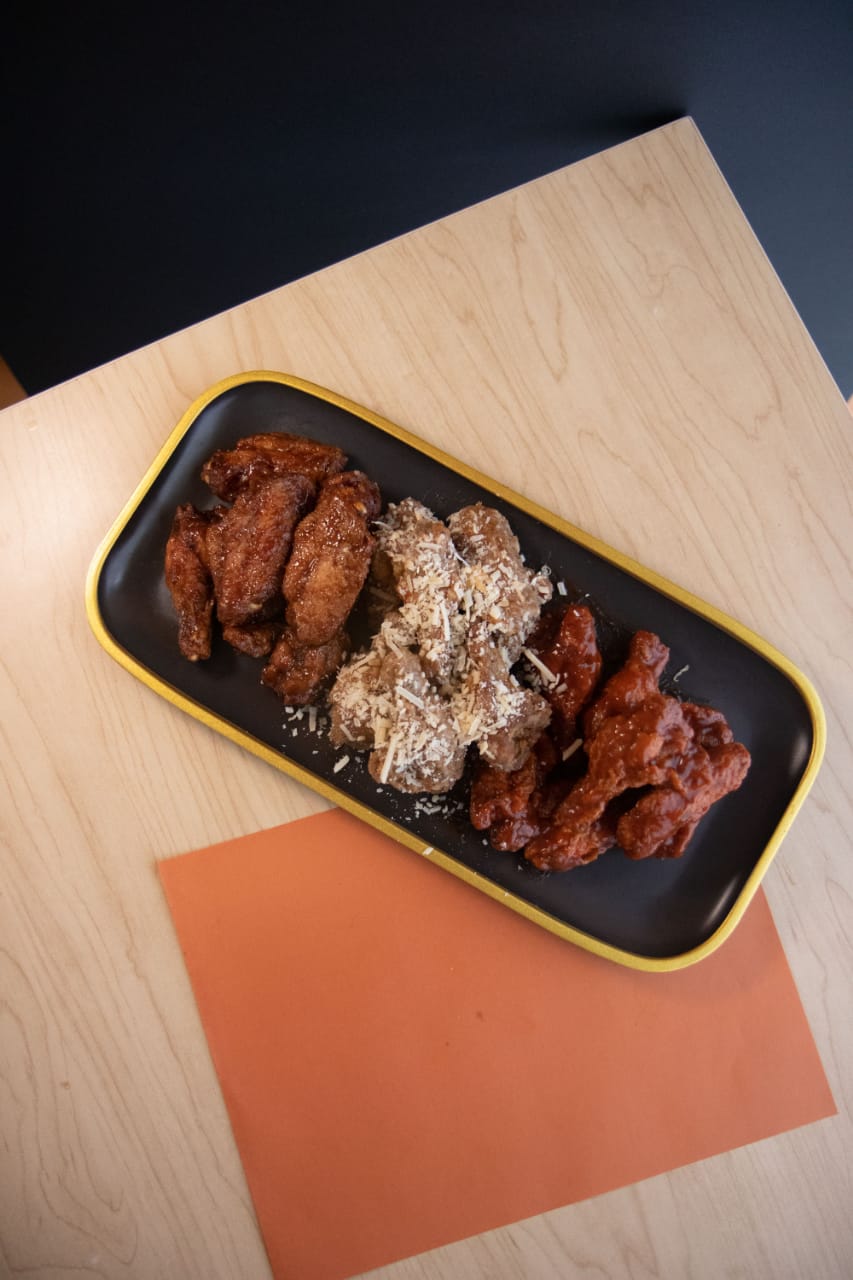 8 Piezas de alitas de pollo con papas salsa a elegir con palitos de apio y zanahoria.