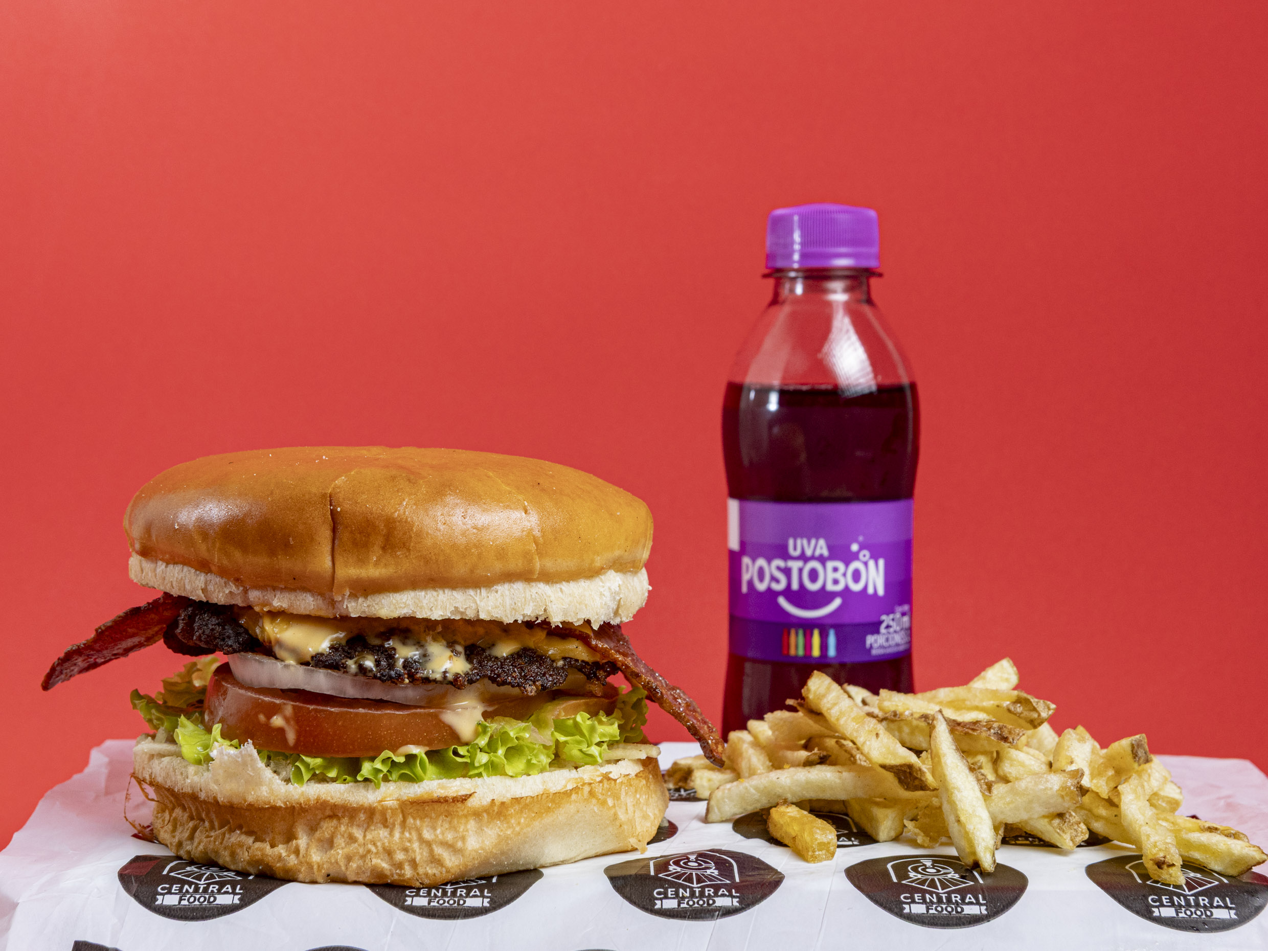 carne 100% de res, tocineta, queso cheddar, tomate, cebolla, lechuga, salsa de la casa, papa francesa y gaseosa 250ml