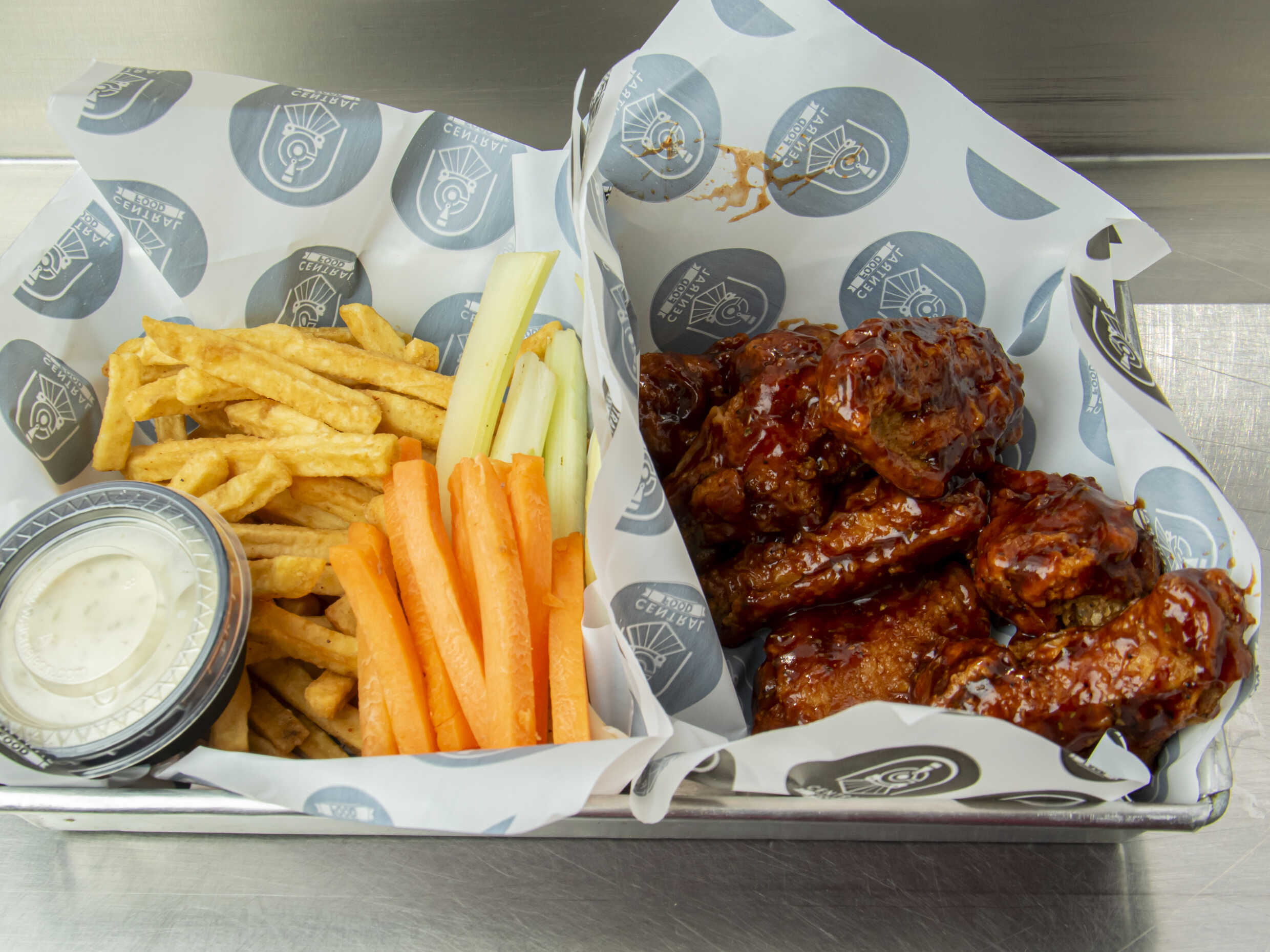 26 Piezas de alitas de pollo con papas salsa a elegircon palitos de apio y zanahoria.