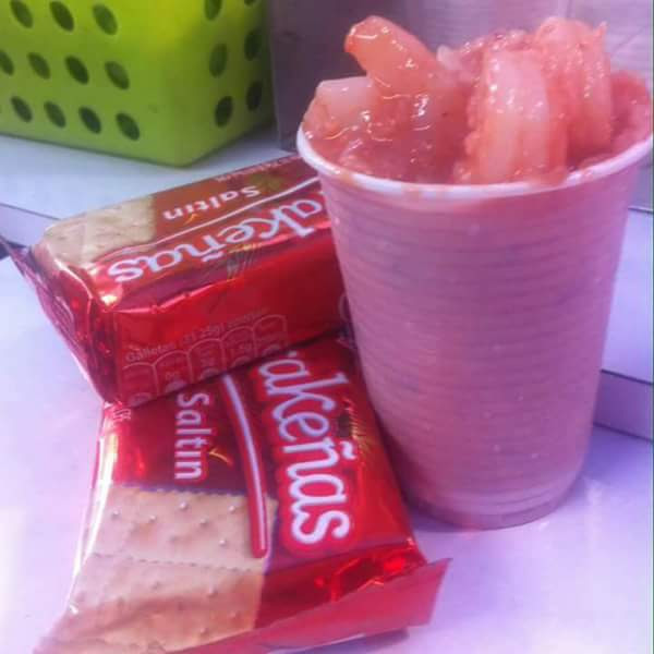 Camarones, cebolla roja picada, mayonesa, salsa de tomate, limón, agua de ajo, aceite de oliva, sal y ají al gusto.