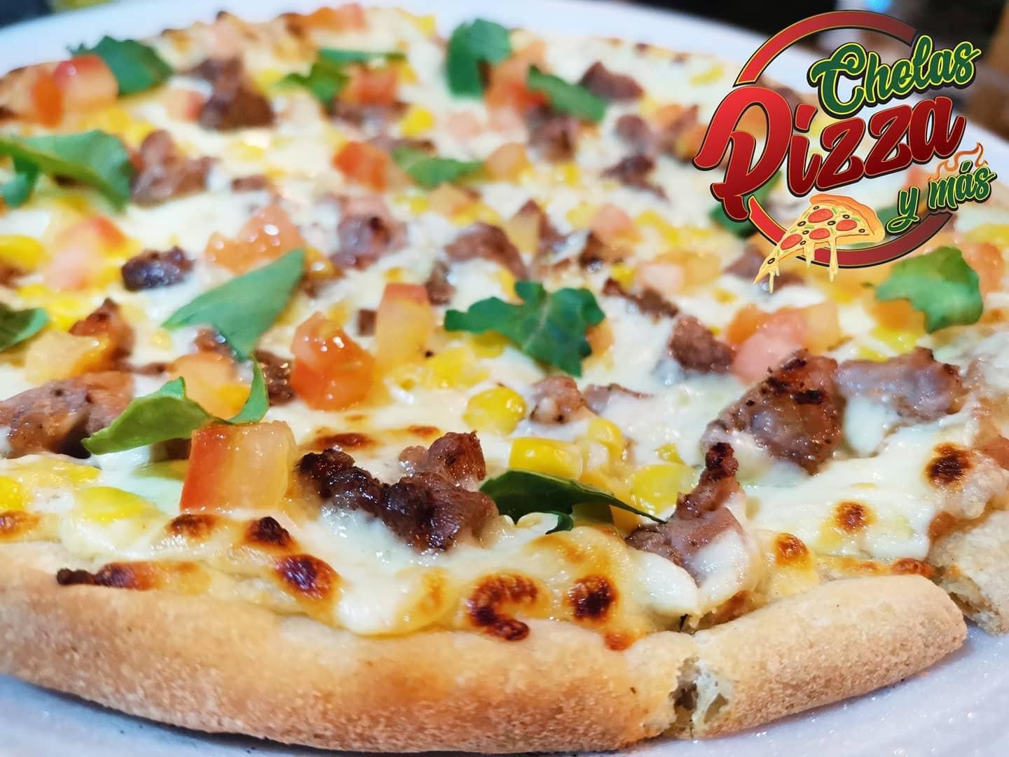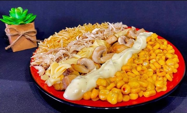 Delicioso pollo mechado con champiñones salteados a la plancha, mozzarella, maíz, papita fosforito y salsas de la casa.