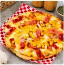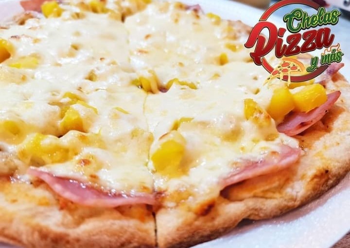 Pollo en trocitos, jamón & piña, maíz, mozzarella, papita fosforito y salsas de la casa.