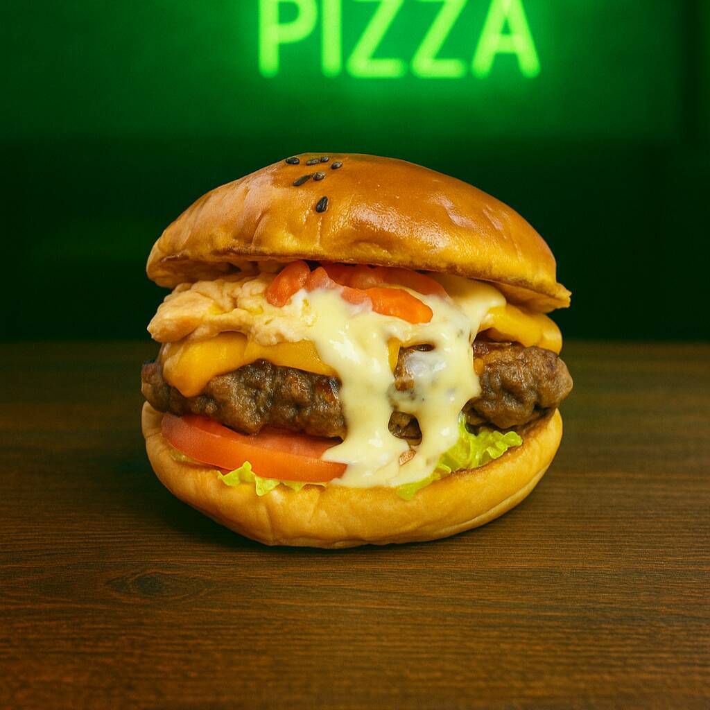 Pan brioche - blend de carne 150 g -chorizo-queso-platanito maduro huevo frito - vegetales con salsa de la casa.