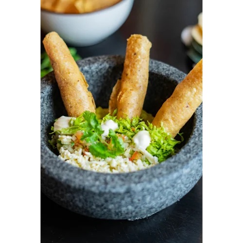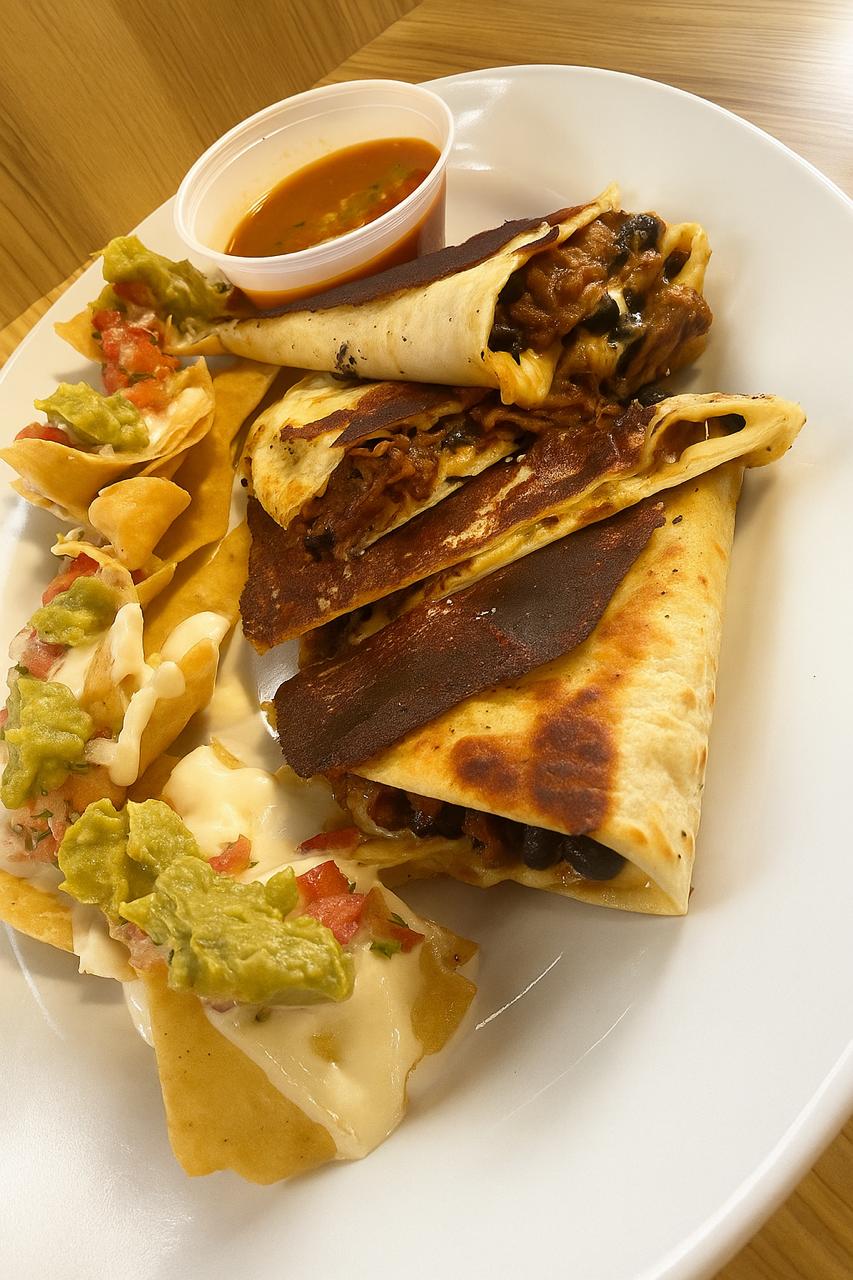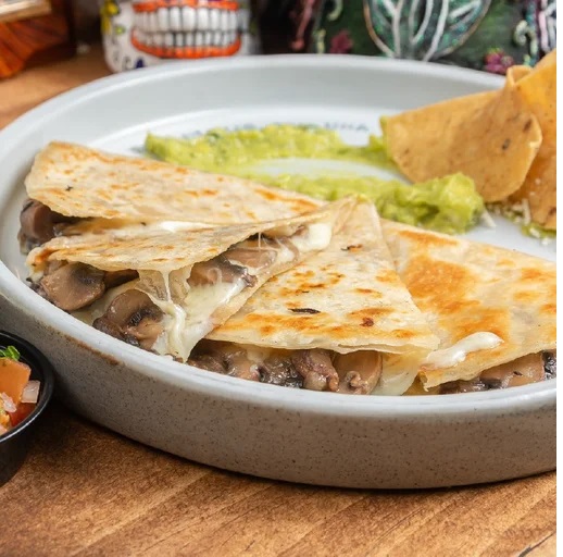 Tortillas de harina rellenas de queso mozzarella fundido, acompañado de guacamole y salsas de la casa
