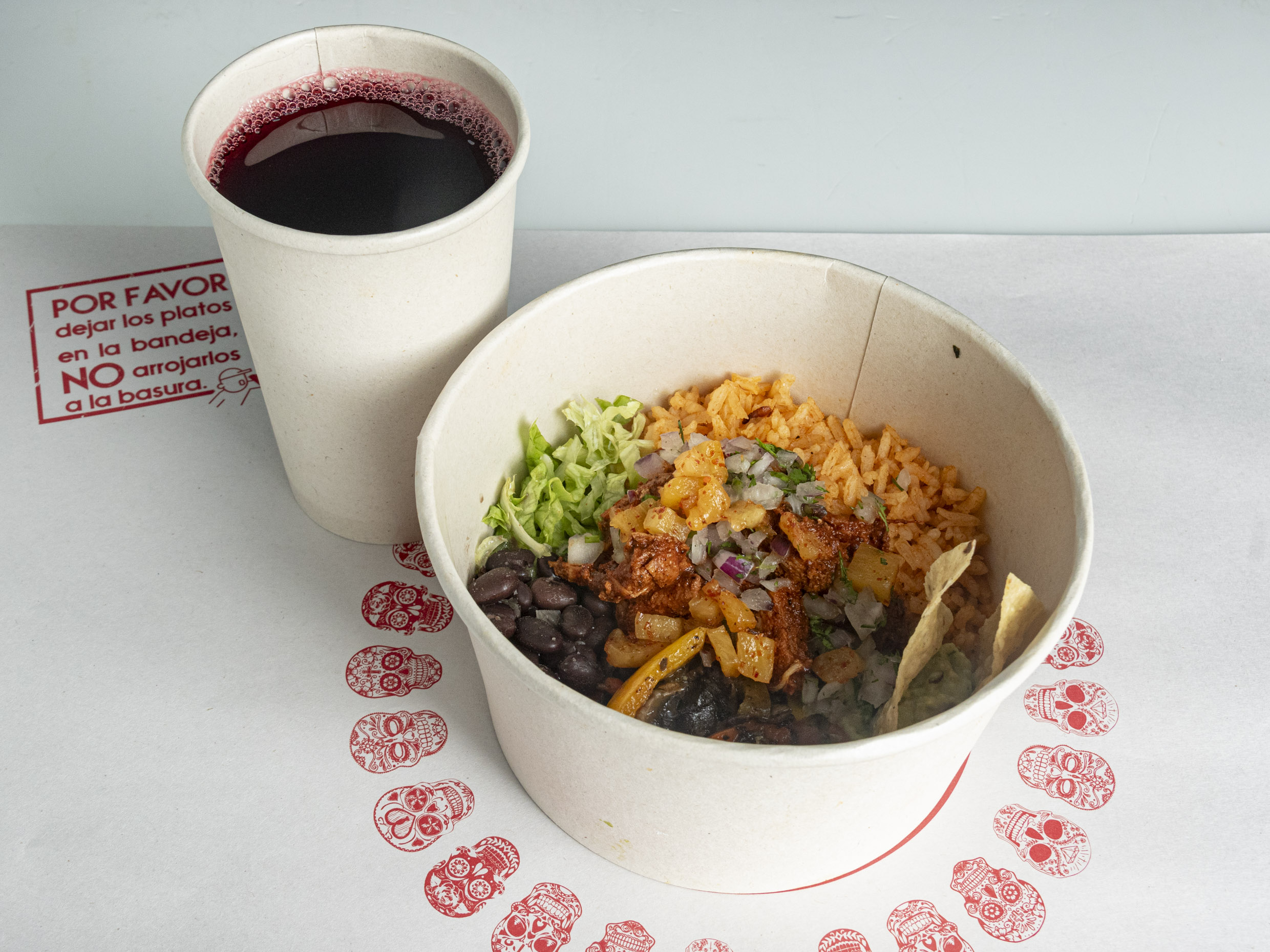 Arroz mexicano, frijoles de la olla, guacamole, pico de gallo, lechuga, champiñones salteados con pimenton rojo, cebolla morada encurtida y totopos