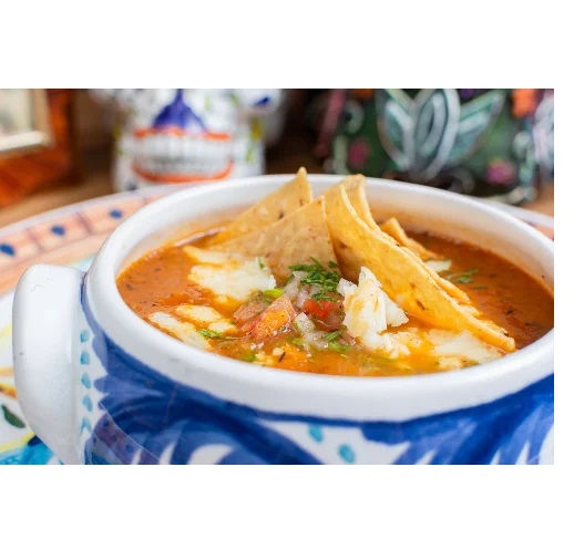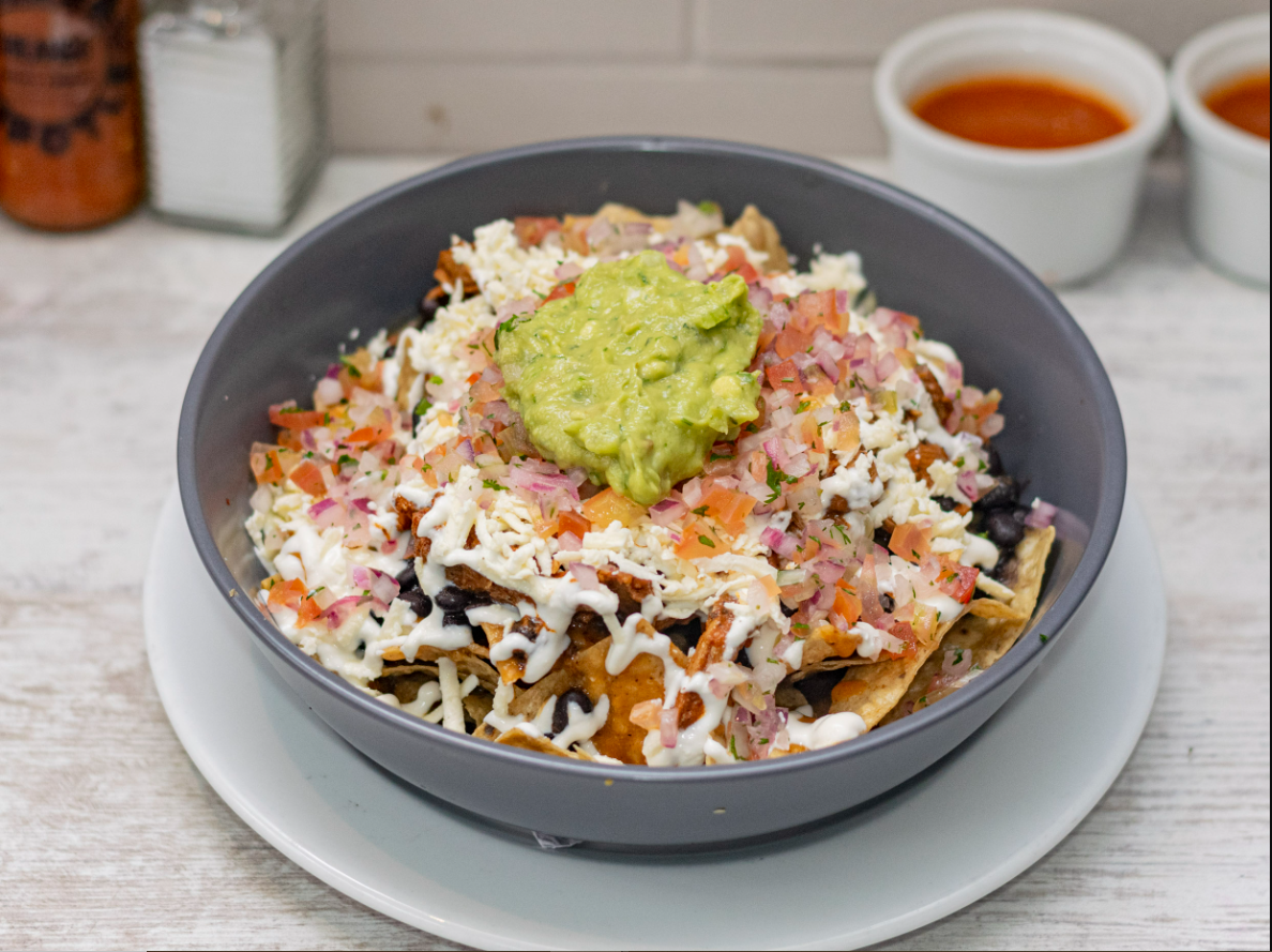 Totopos, frijoles, guacamole, queso costeño, sour cream y pico de gallo