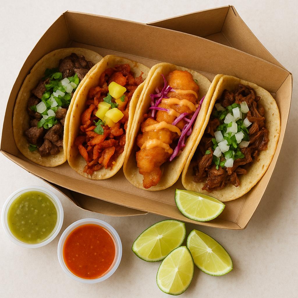 12 tacos (3 unidades de cerdo al pastor, 3 unidades de birria, 3 unidades de cochinita, 3 unidades de carne asada y 3 bebidas a elección