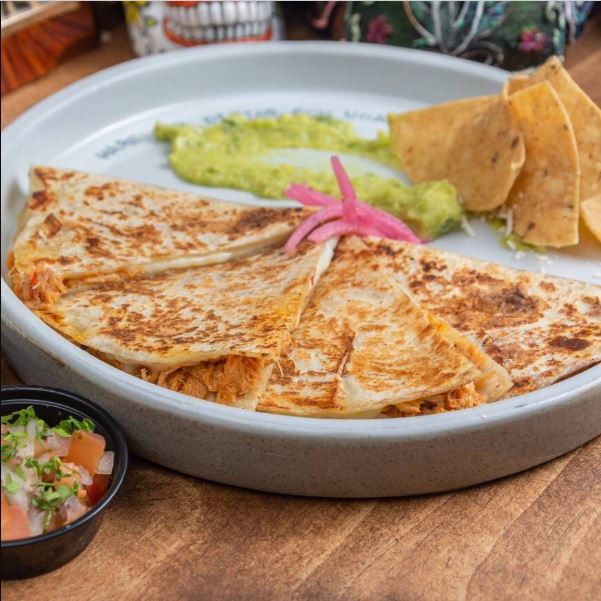 Tortilla de harina rellenas de queso mozzarella fundido, acompañado de guacamole y salsas de la casa (2 unidades).