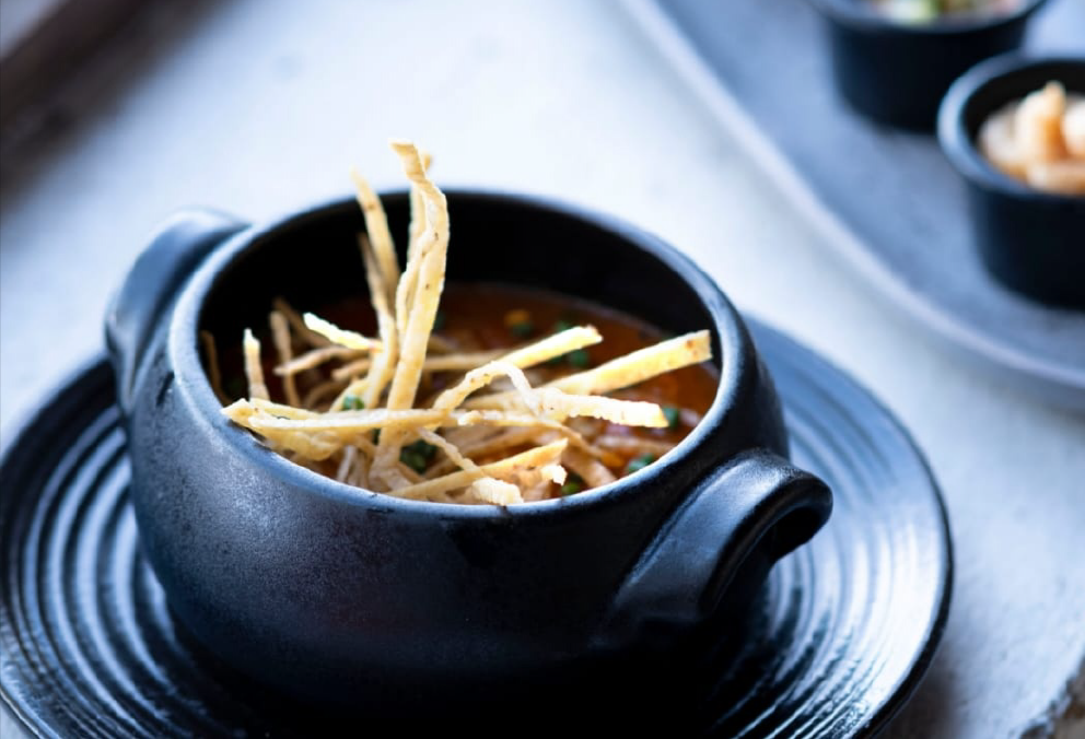 Caldillo de tomates tatemado, acompañado de tortilla frita. Aguacate, queso mozzarella y sour cream.