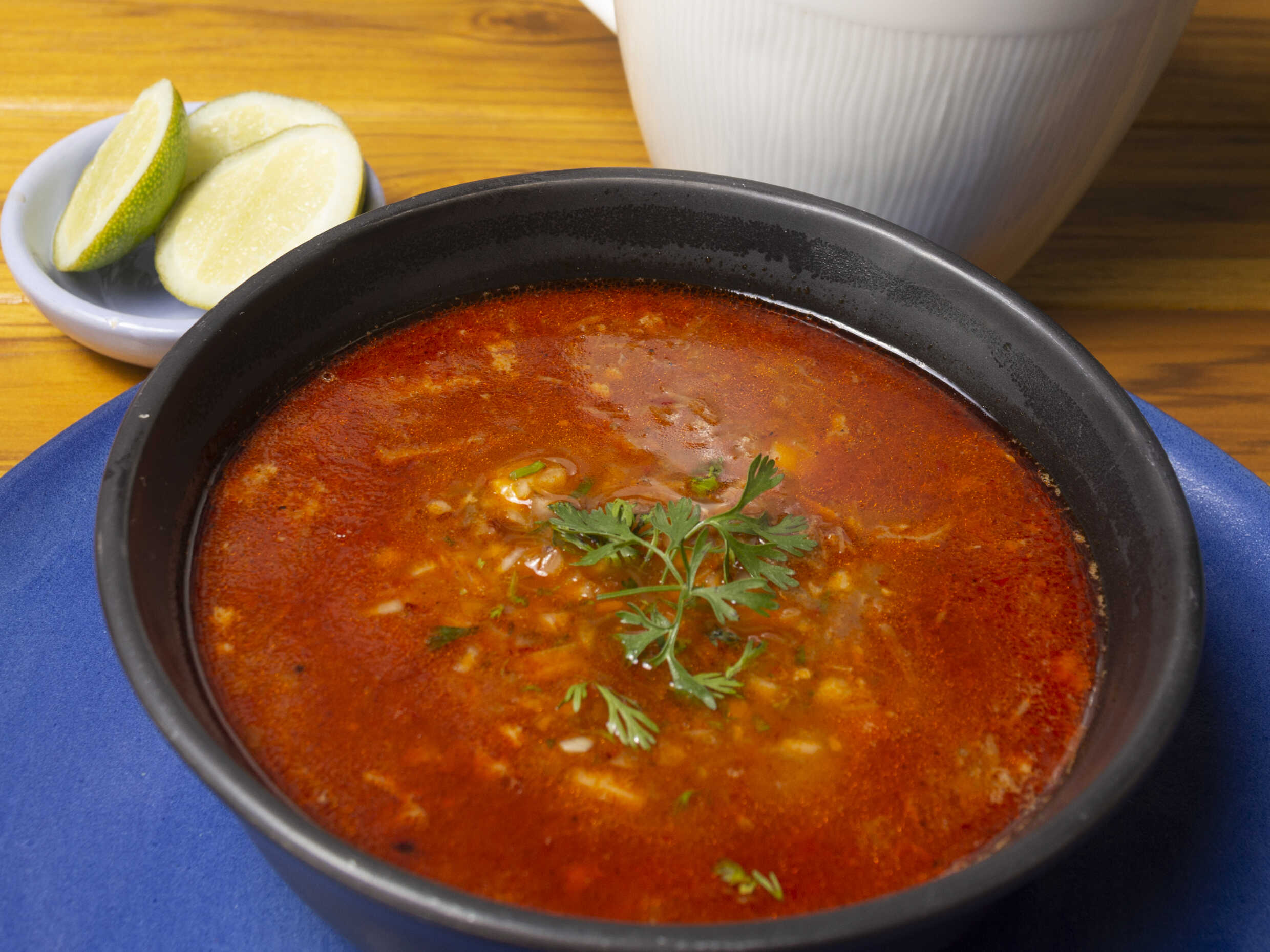 Sobrebarriga adobada en salsa de chiles secos, con mix de cebolla y cilantro y salsa de la casa, acompañado de caldito de res