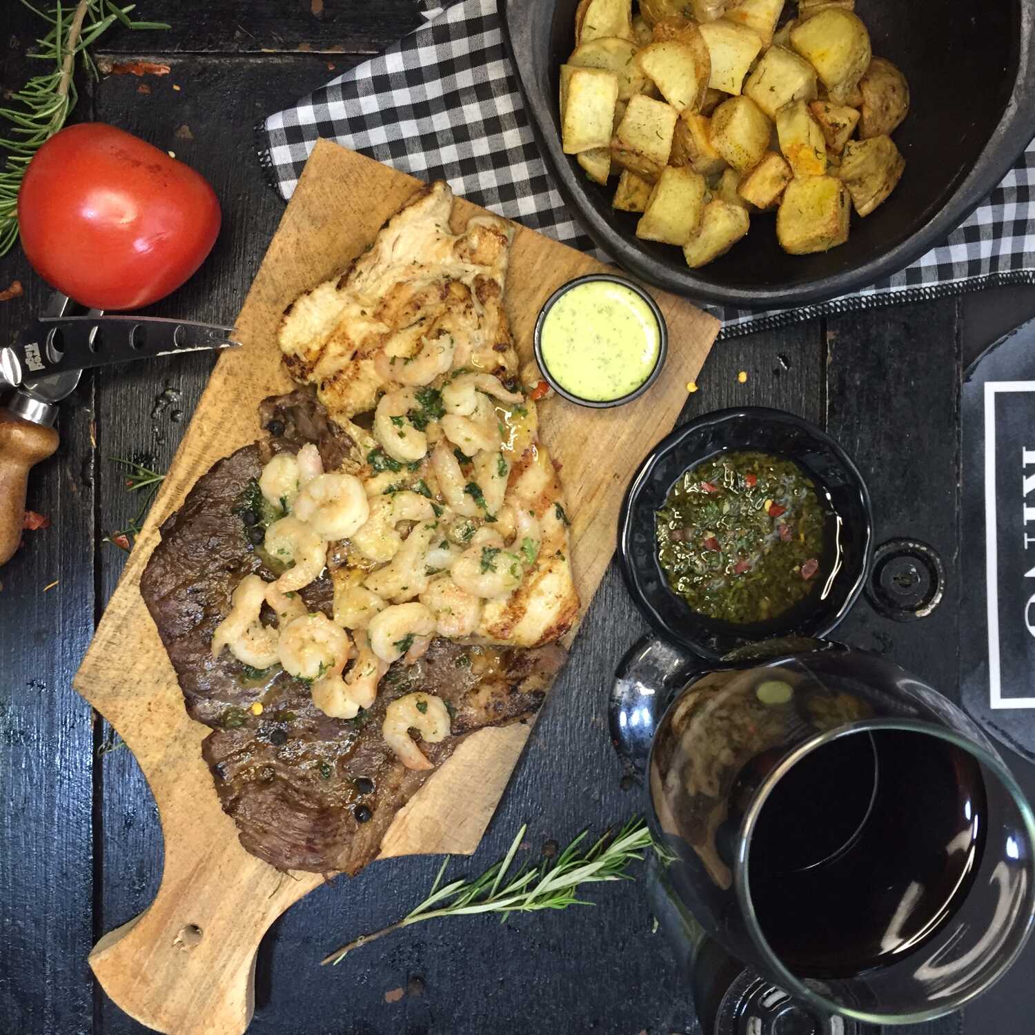 Asado 90gr de pechuga, 90gr de res y 80gr de camaron fresco, con chimichurri argentino y salsa gardel de la chef. Elige tus acompañamientos.