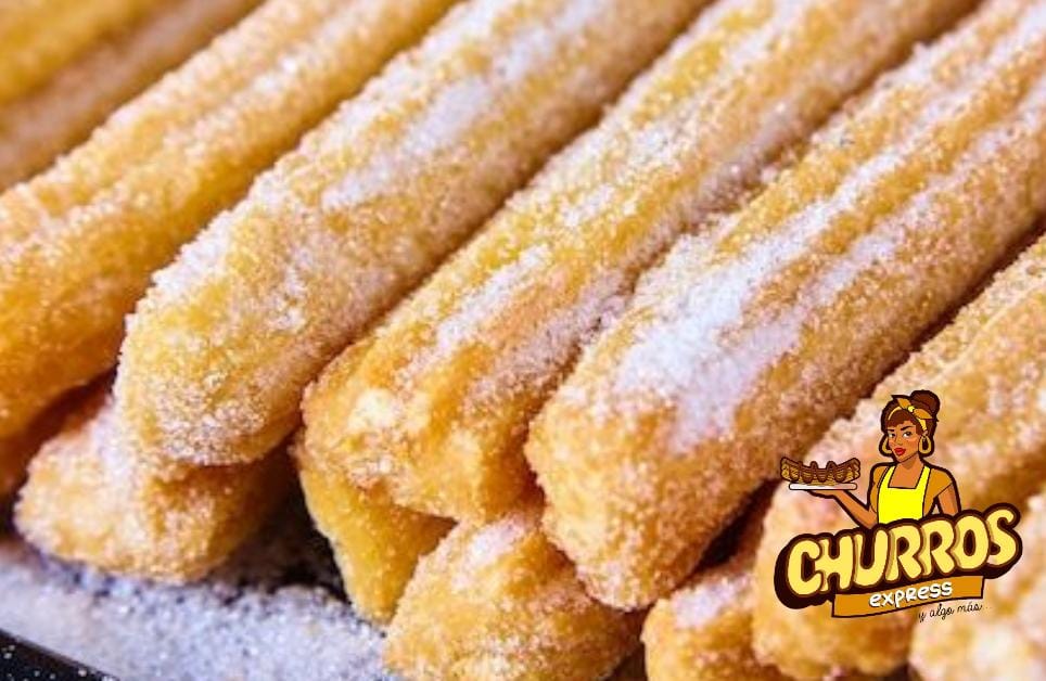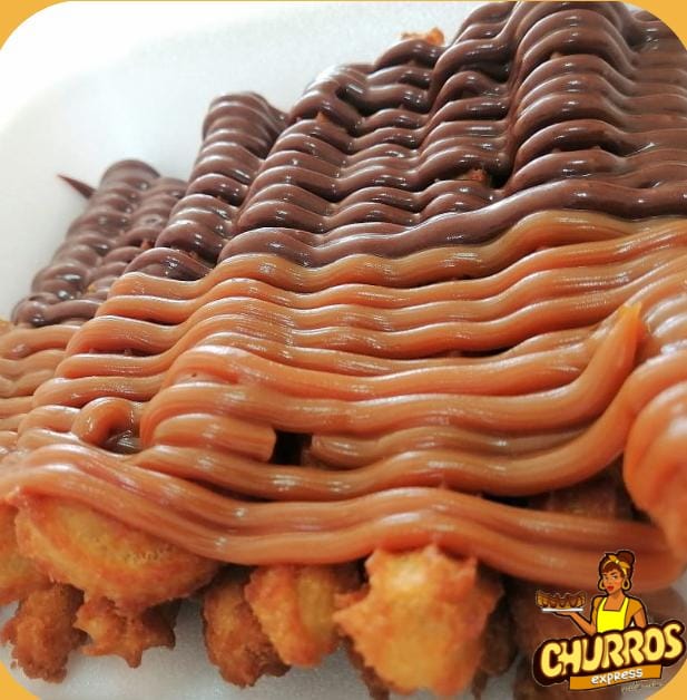 12 churros de aproximadamente 16 cm, crujientes y dorados, churros autenticos españoles cubiertos con el sabor de tu elección 2 toppings para personalizar, puede escoger 2 salsas a elecccion