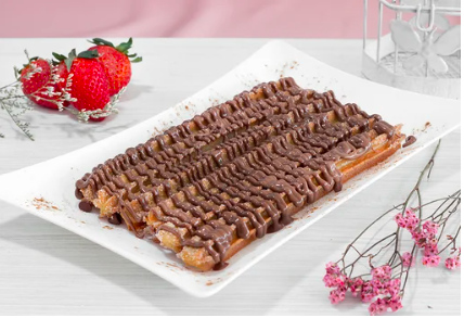 Churros azucarados cubiertos con Nutella y acompañados con trocitos de fresa, elige la cantidad 6, 12 o 24.