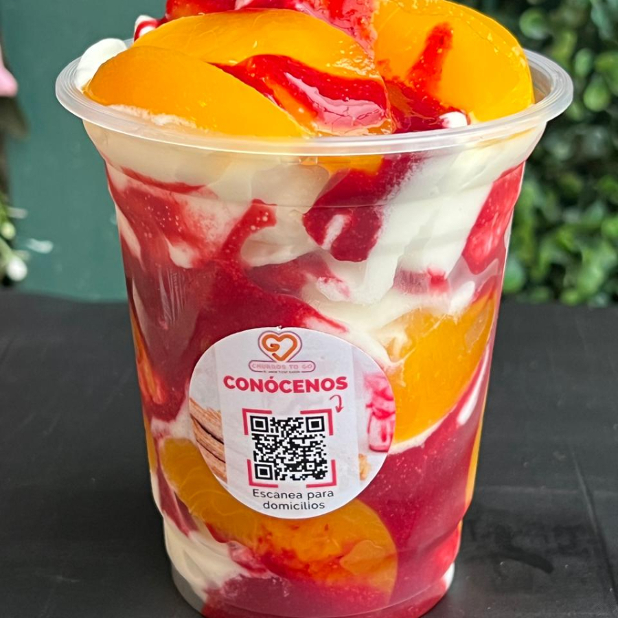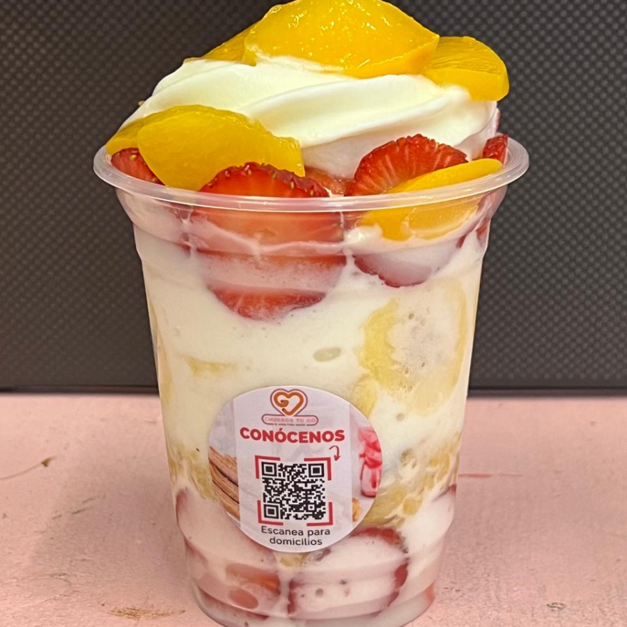 Helado artesanal, fresa, durazno, banano y granola (no incluye churros).