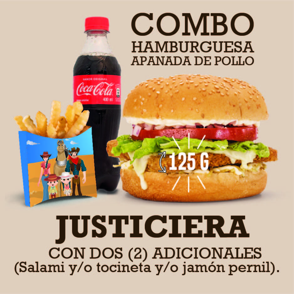 Hamburguesa Justiciera apanada de pollo con papa a la francesa de 75 g, papa criolla de 100 g o papa casco de 100 g y gaseosa de 400 ml.