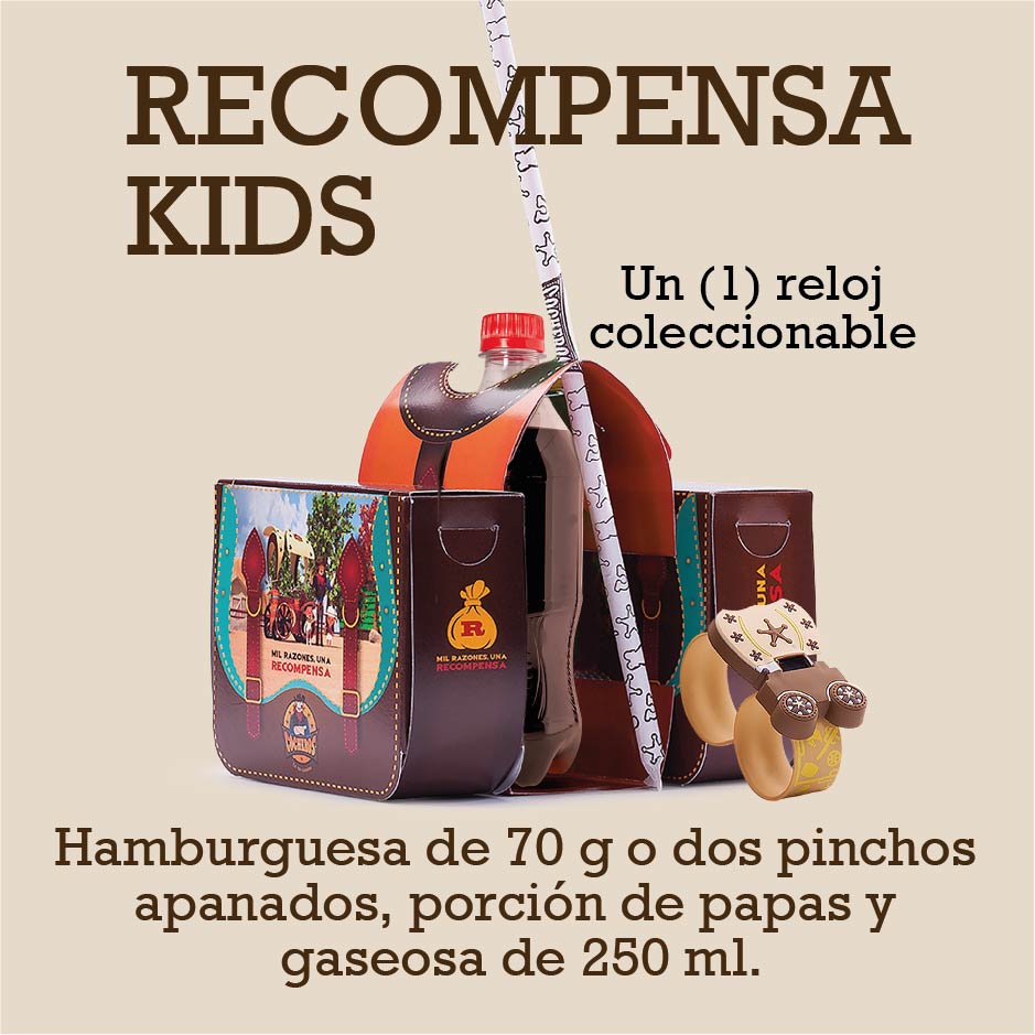 Hamburguesa de res de 70 g o dos pinchos apanados, porción de papas y gaseosa de 250 ml, más reloj coleccionable.