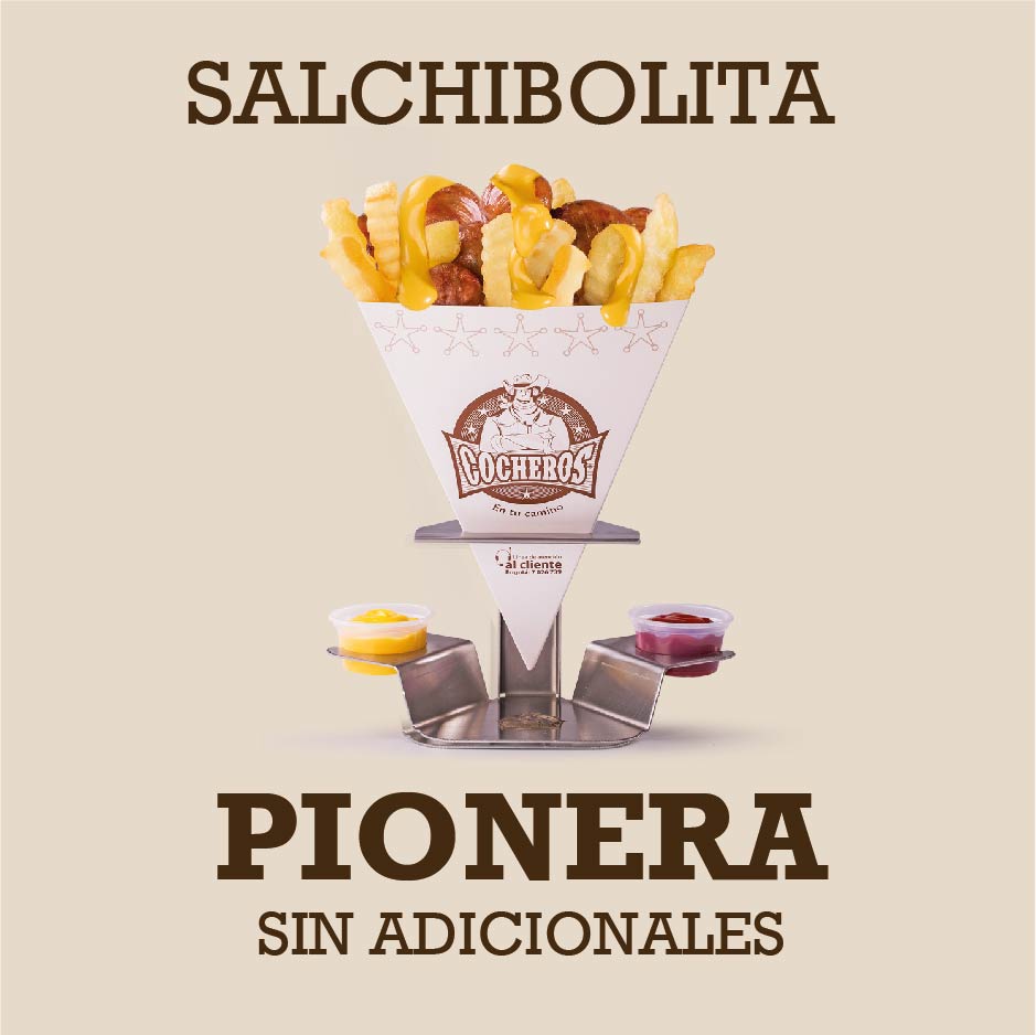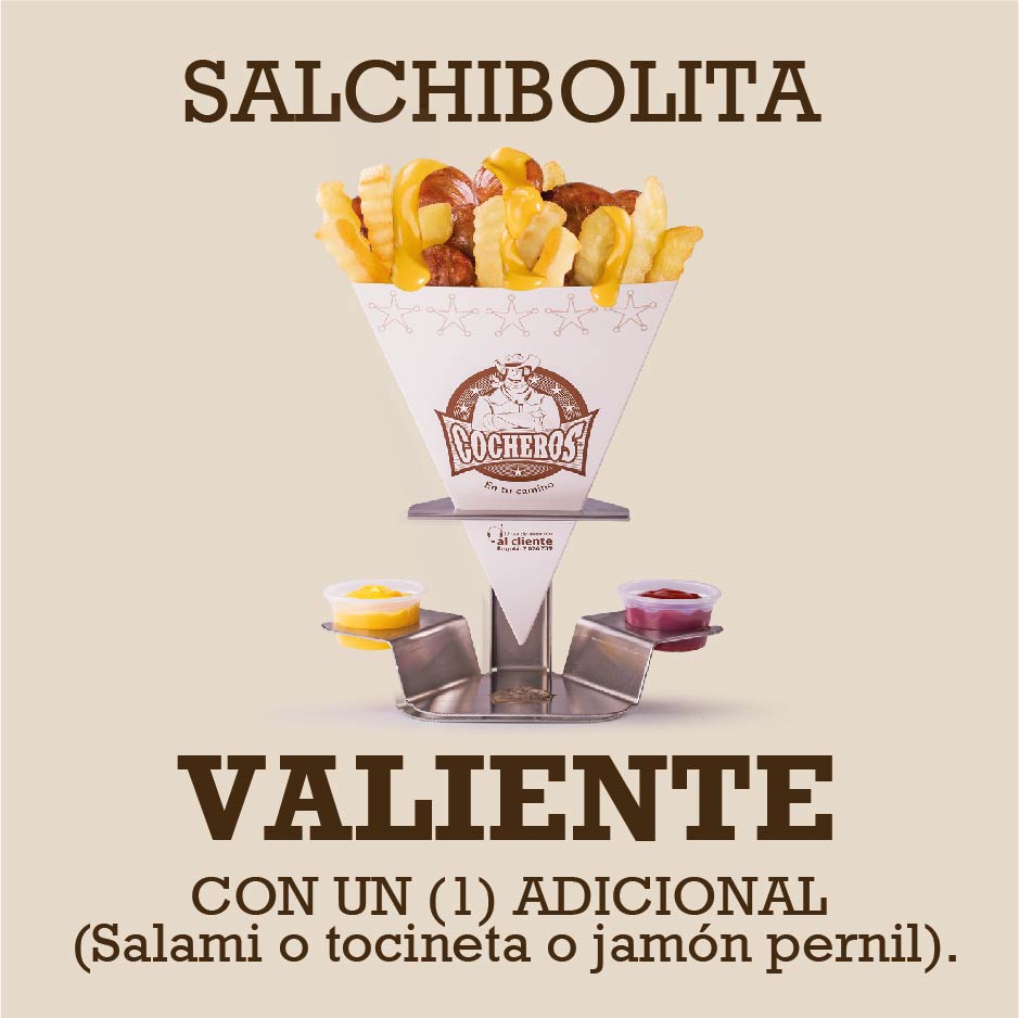 150 g de papa francesa o 200 g de papa casco o 200 g de papa criolla más salsa queso cheddar o salsa cocheros, porción de salchibolita, salami y/o tocineta y/o jamón pernil.