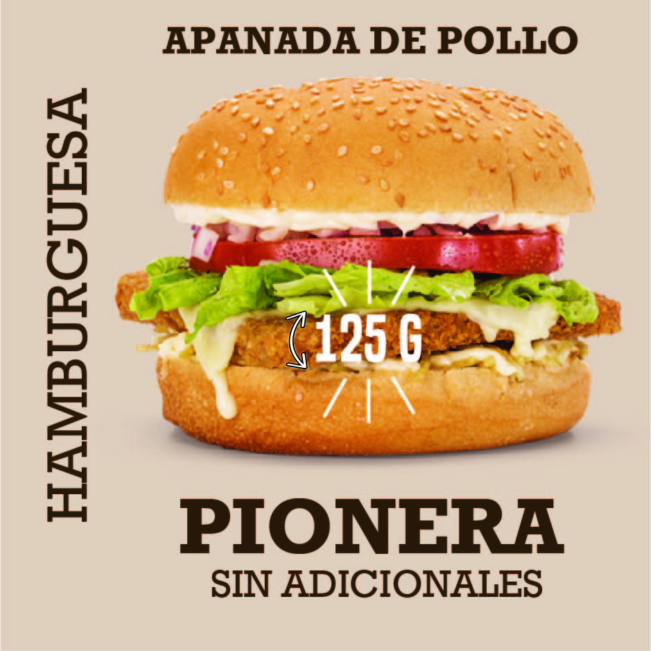 Pan tradicional o finas hierbas, hamburguesa de pollo apanado de 125 g, queso doble crema o queso tipo cheddar, papa cabello de ángel, vegetales y salsas.