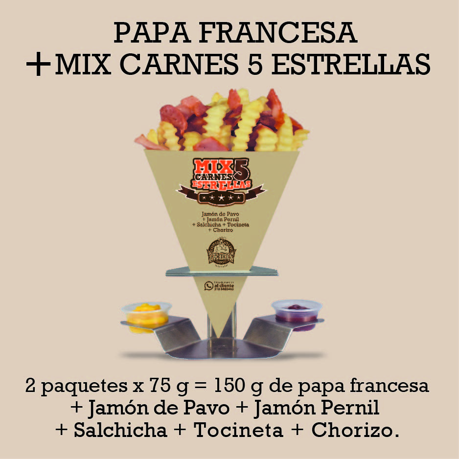 150 g de papa francesa + jamón de pavo + jamón pernil + salchicha + tocineta + chorizo.