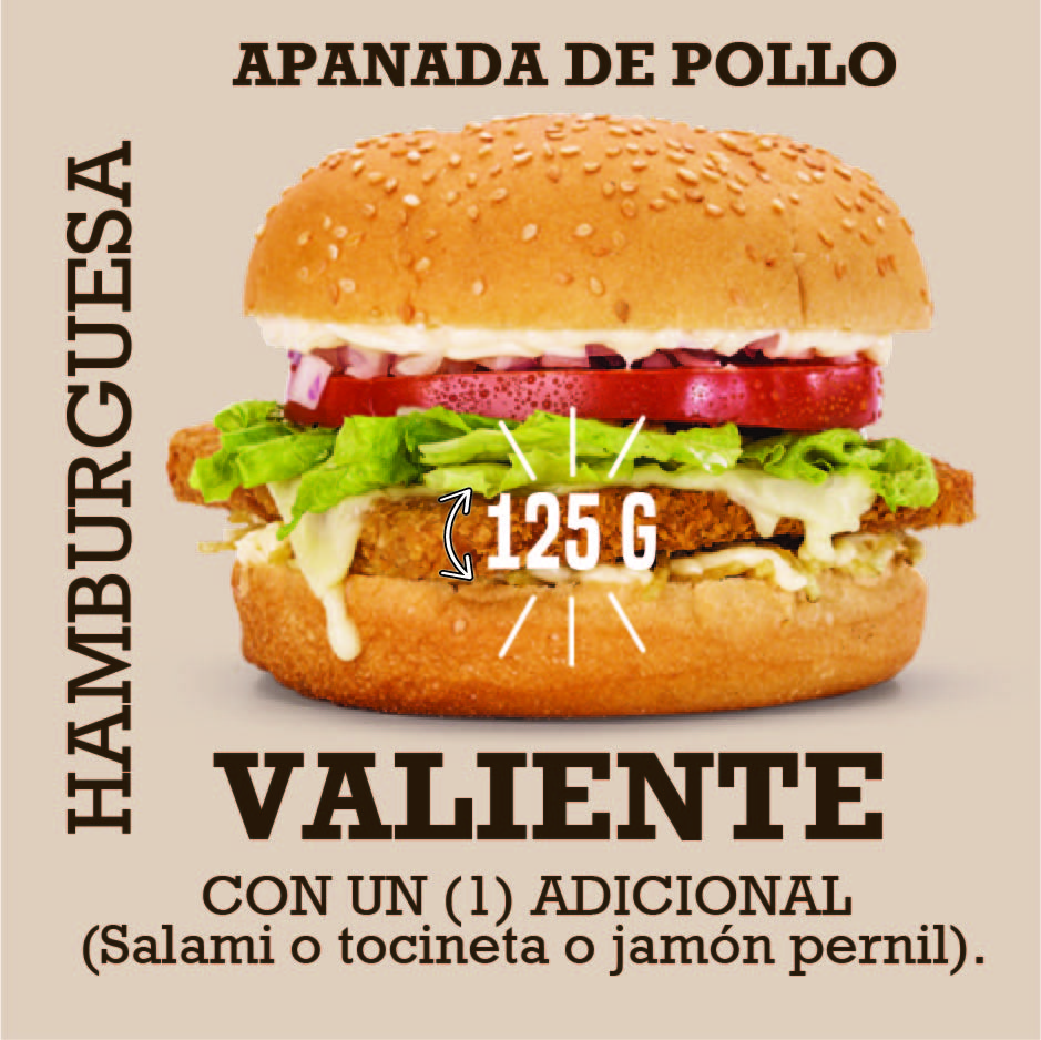 Pan tradicional o finas hierbas, hamburguesa de pollo apanado de 125 g, queso doble crema o queso tipo cheddar, papa cabello de ángel, vegetales, salsas, salami o tocineta o jamón pernil.