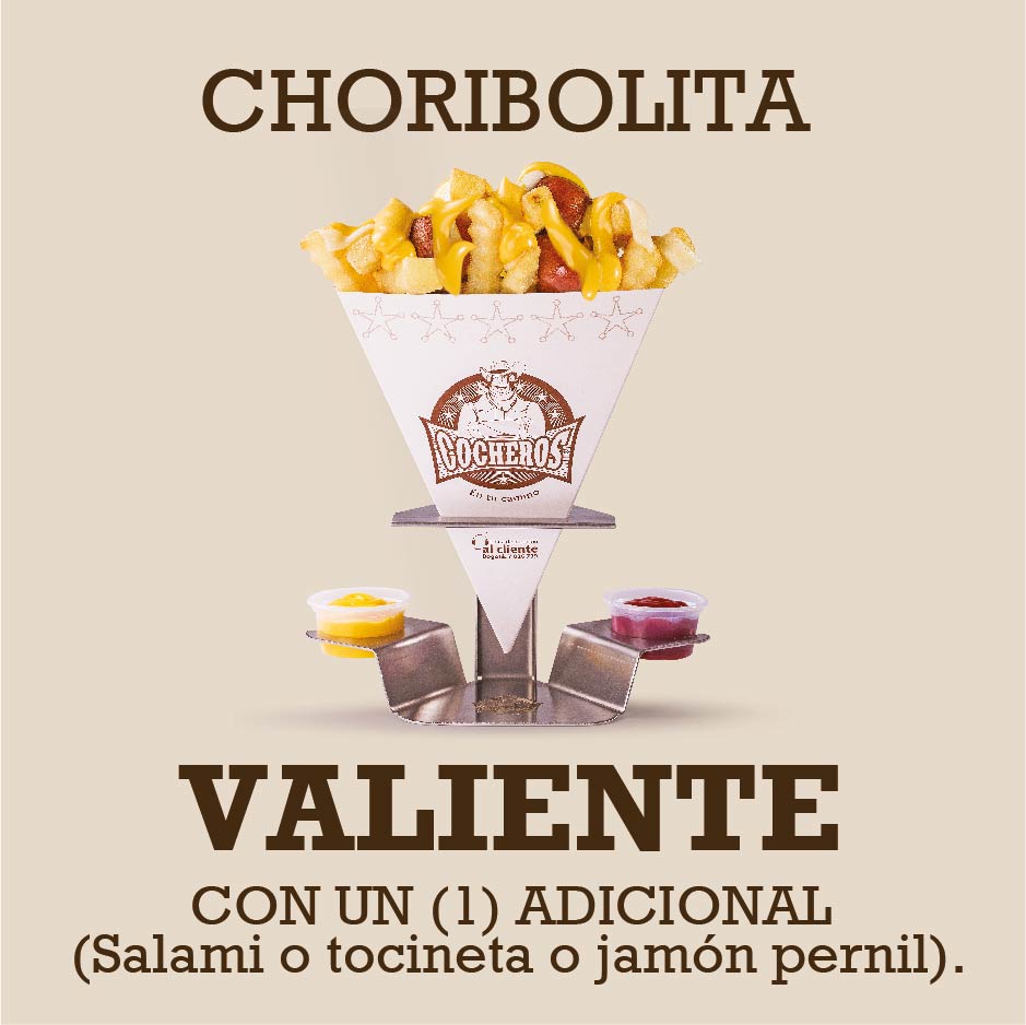 150 g de papa francesa o 200 g de papa casco o 200 g de papa criolla más salsa queso cheddar o salsa cocheros y porción de choribolita.