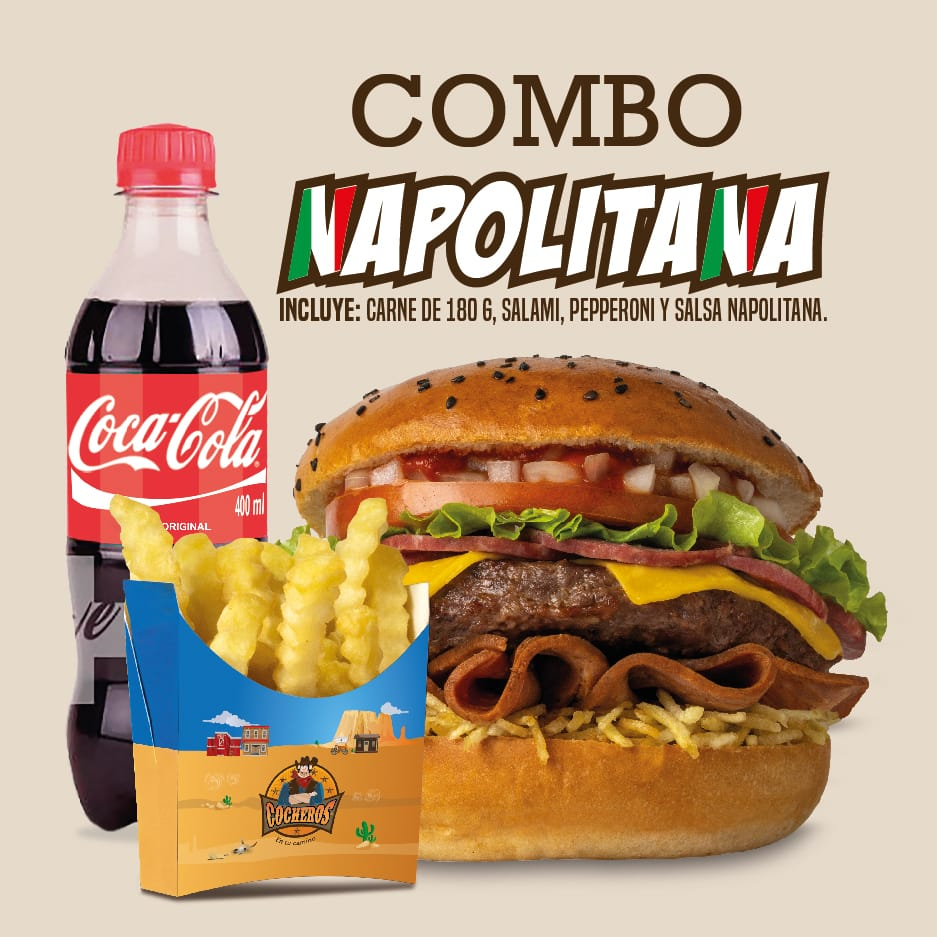 Hamburguesa 180 g Napolitana con papa a la francesa de 75 g, papa criolla de 100 g o papa casco de 100 g y gaseosa de 400 ml.