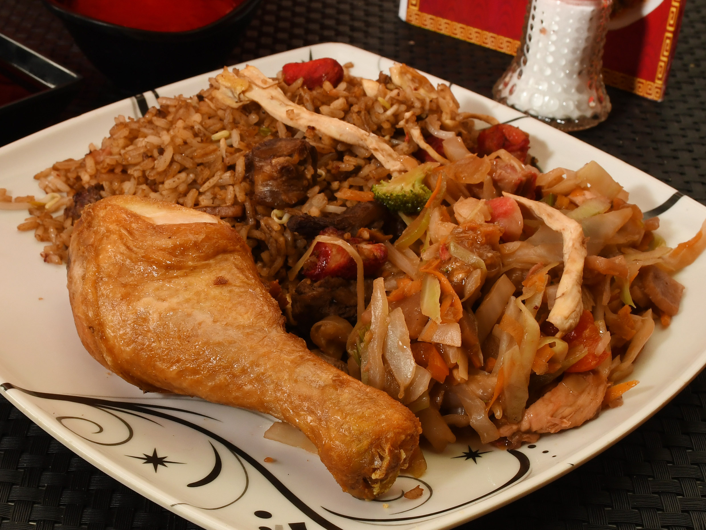 Arroz chino de 400g con chop suey, 2 unidades de pollo en salsa agridulce.