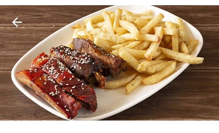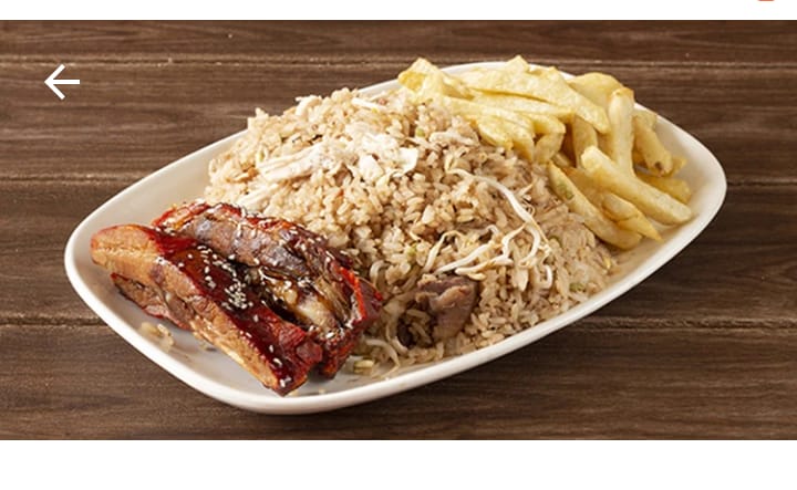 Arroz chino de 400g con papa francesa, 1 costilla de cerdo en salsa BBQ.