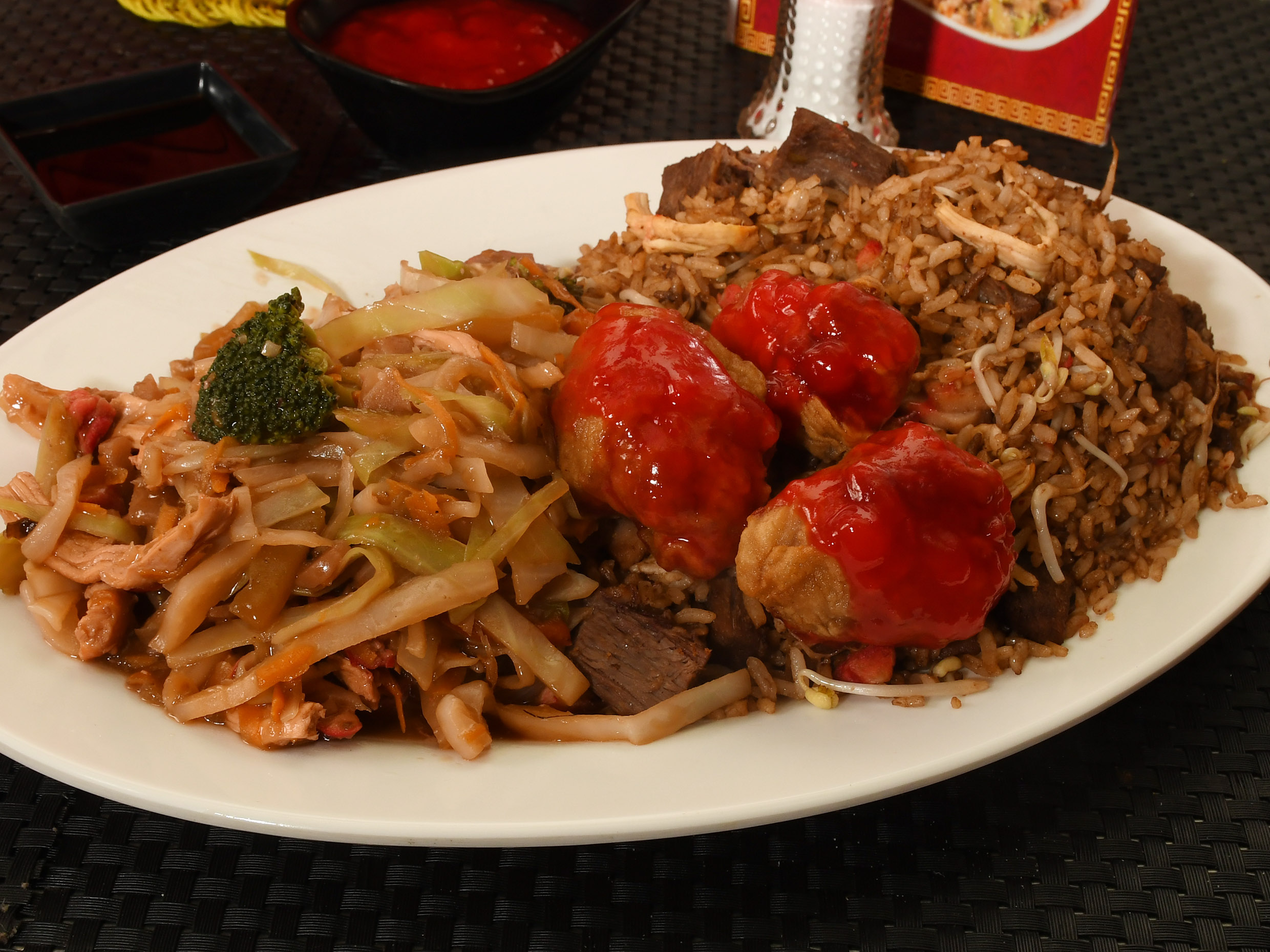 Arroz chino de 700g con chop suey, 3 unidades de pollo agridulce.