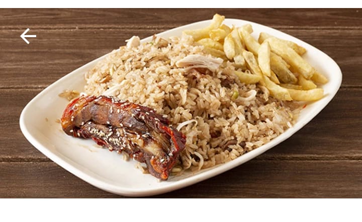 Arroz chino de 700g con papa francesa, 2 costillas en salsa BBQ.