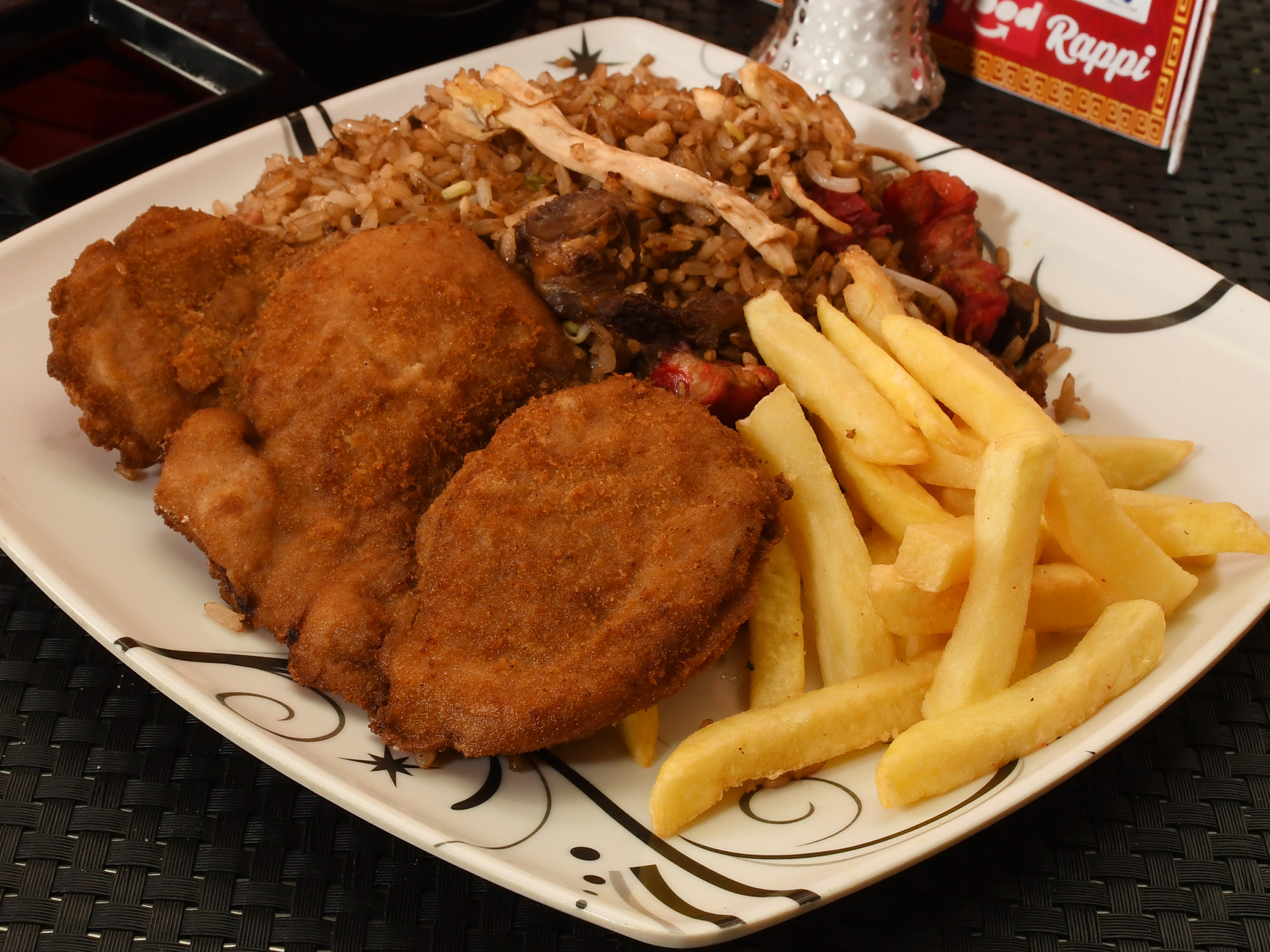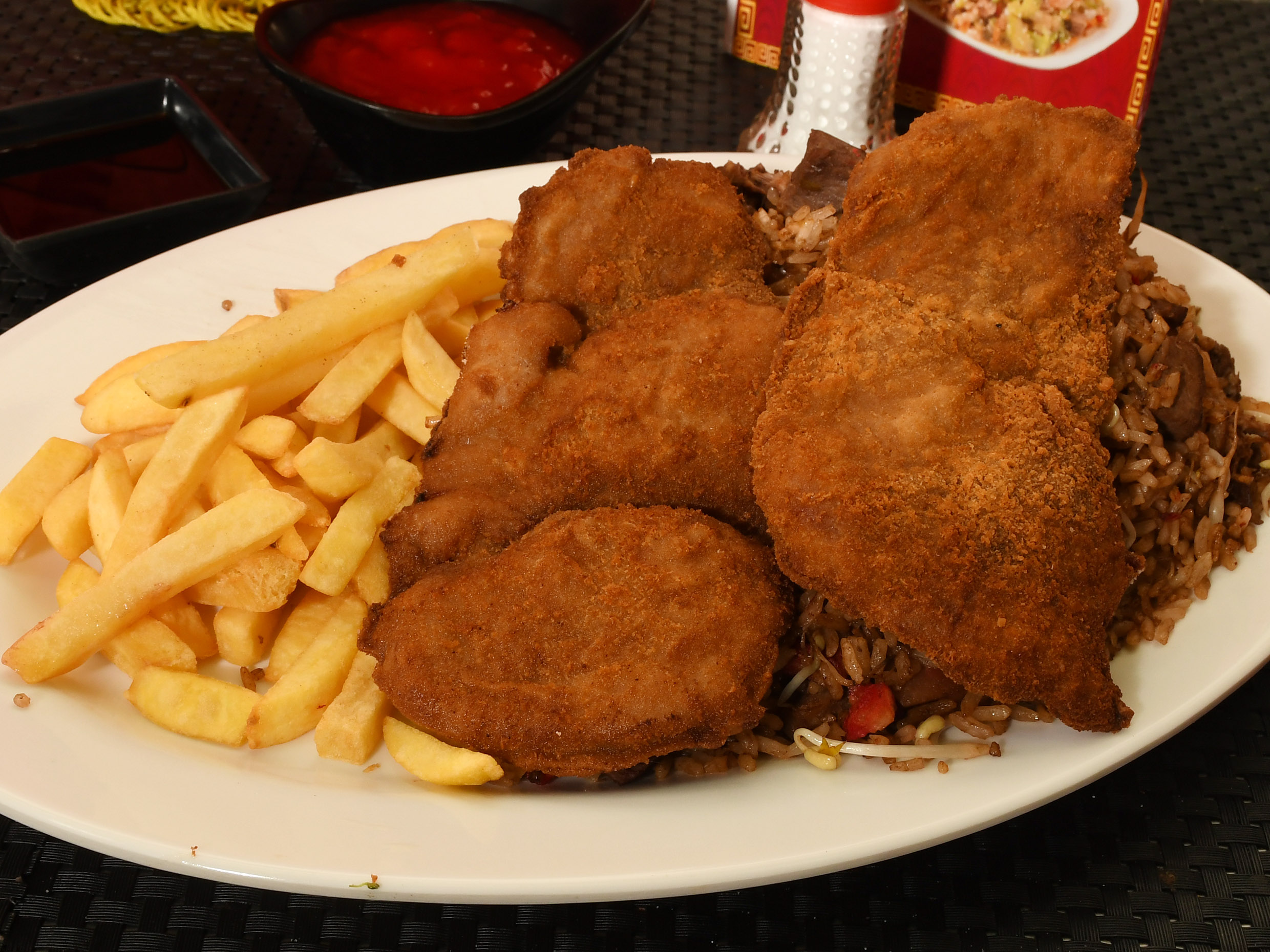Arroz chino de 400g con papa francesa, 1 chuleta de cerdo apanado.