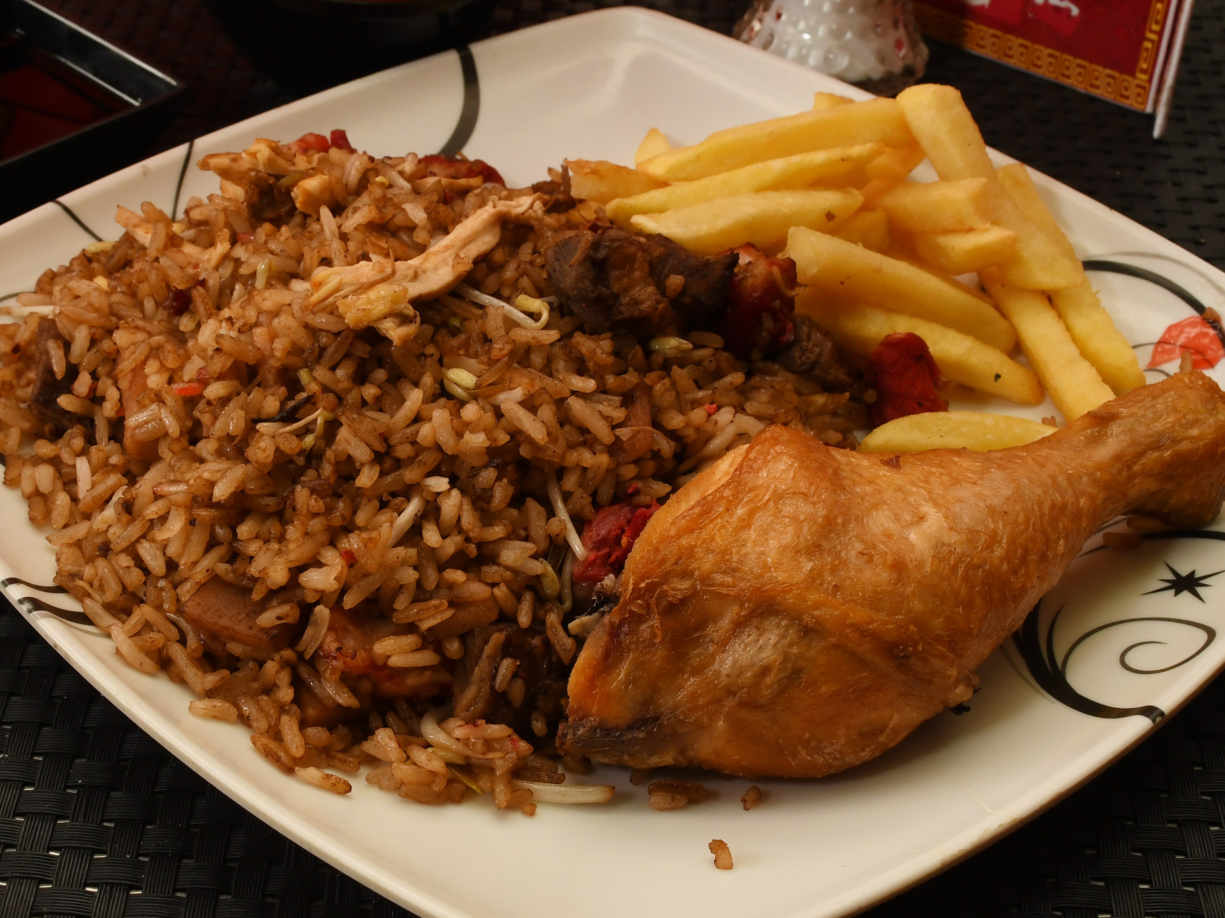 Arroz chino de 400g con papa francesa, 1 presa de pollo.