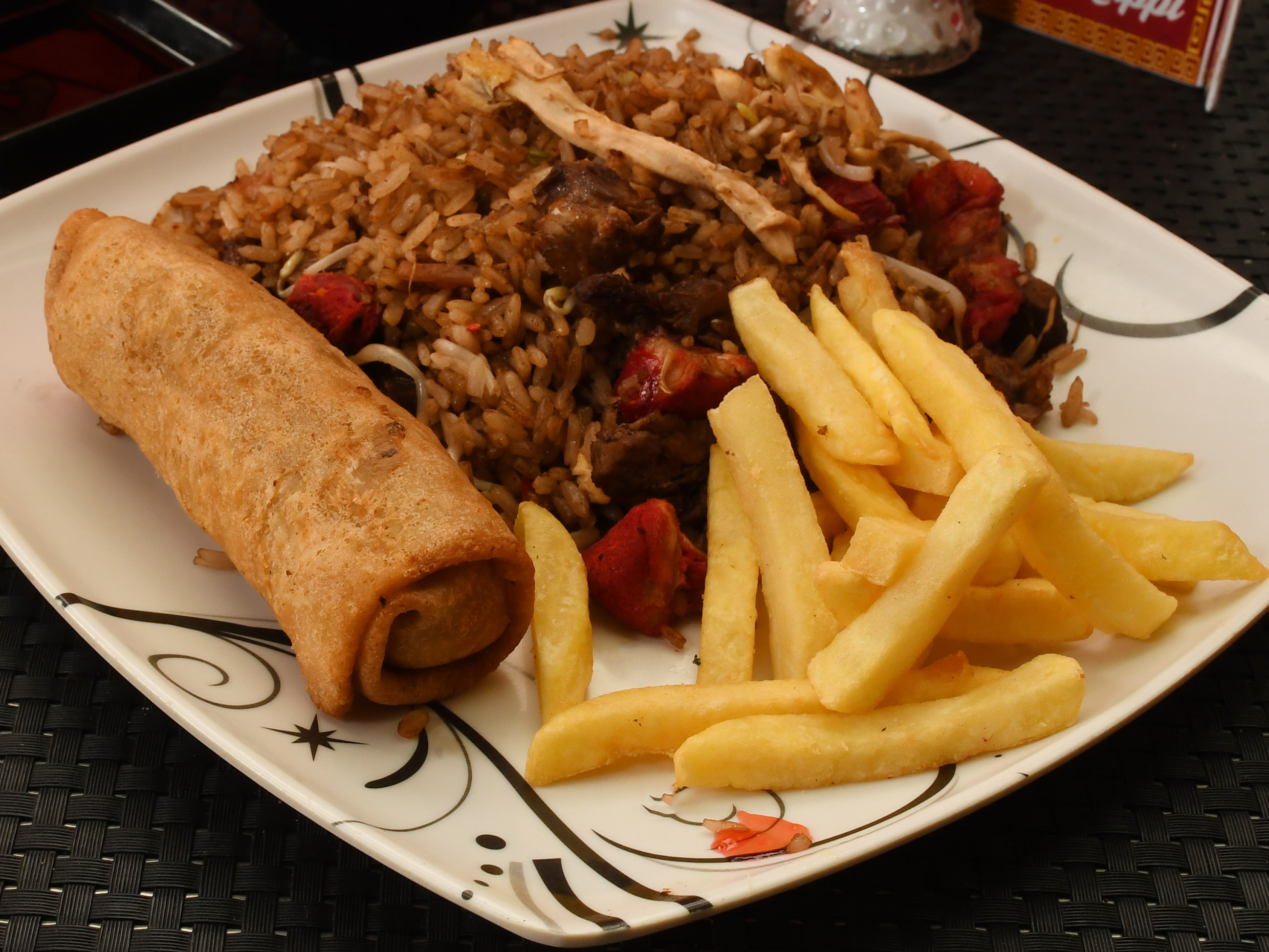 Arroz chino de 400g con papa francesa, 1 lumpia.