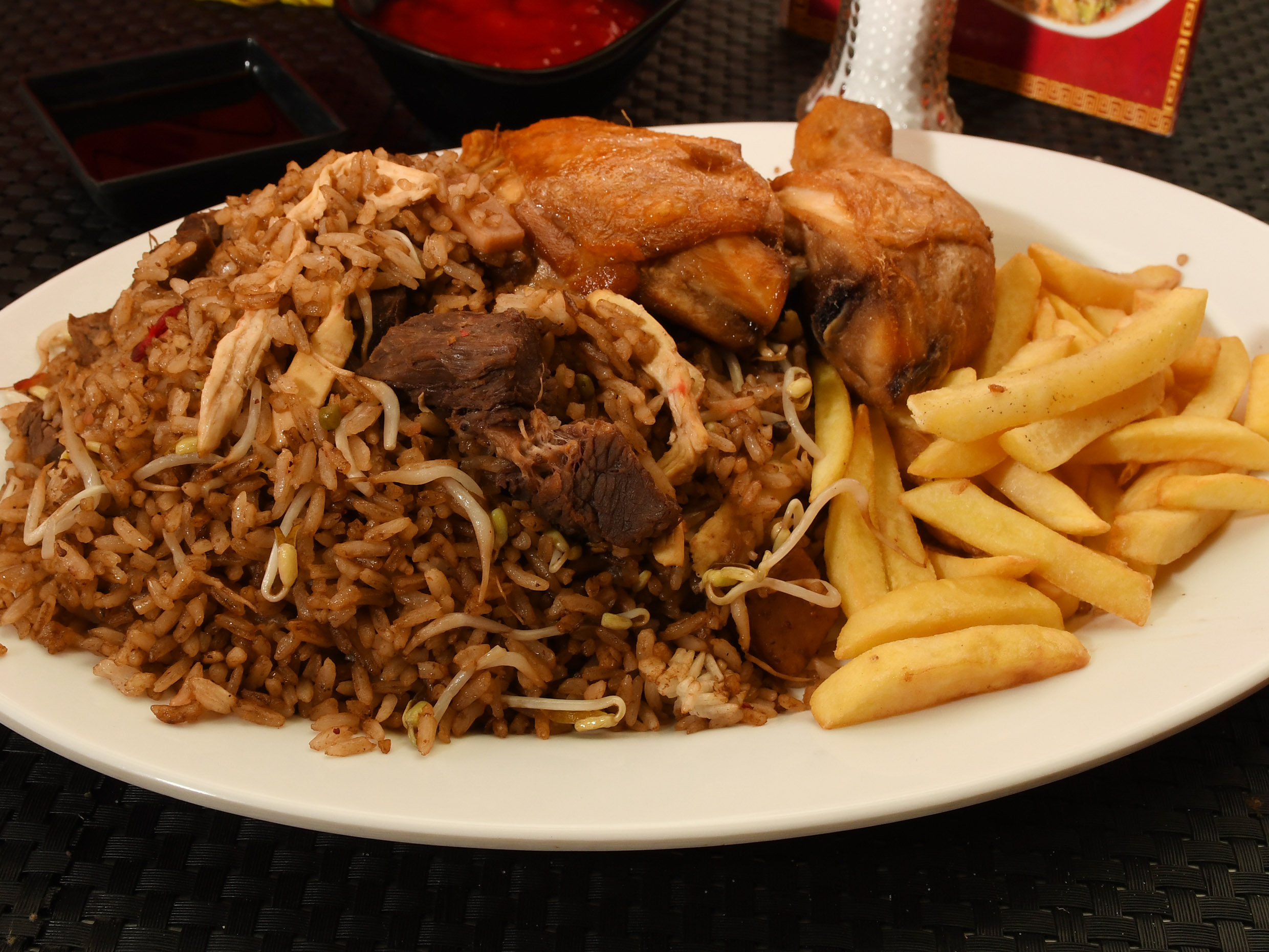 Arroz chino de 700g con papa francesa, 1/4 de pollo.