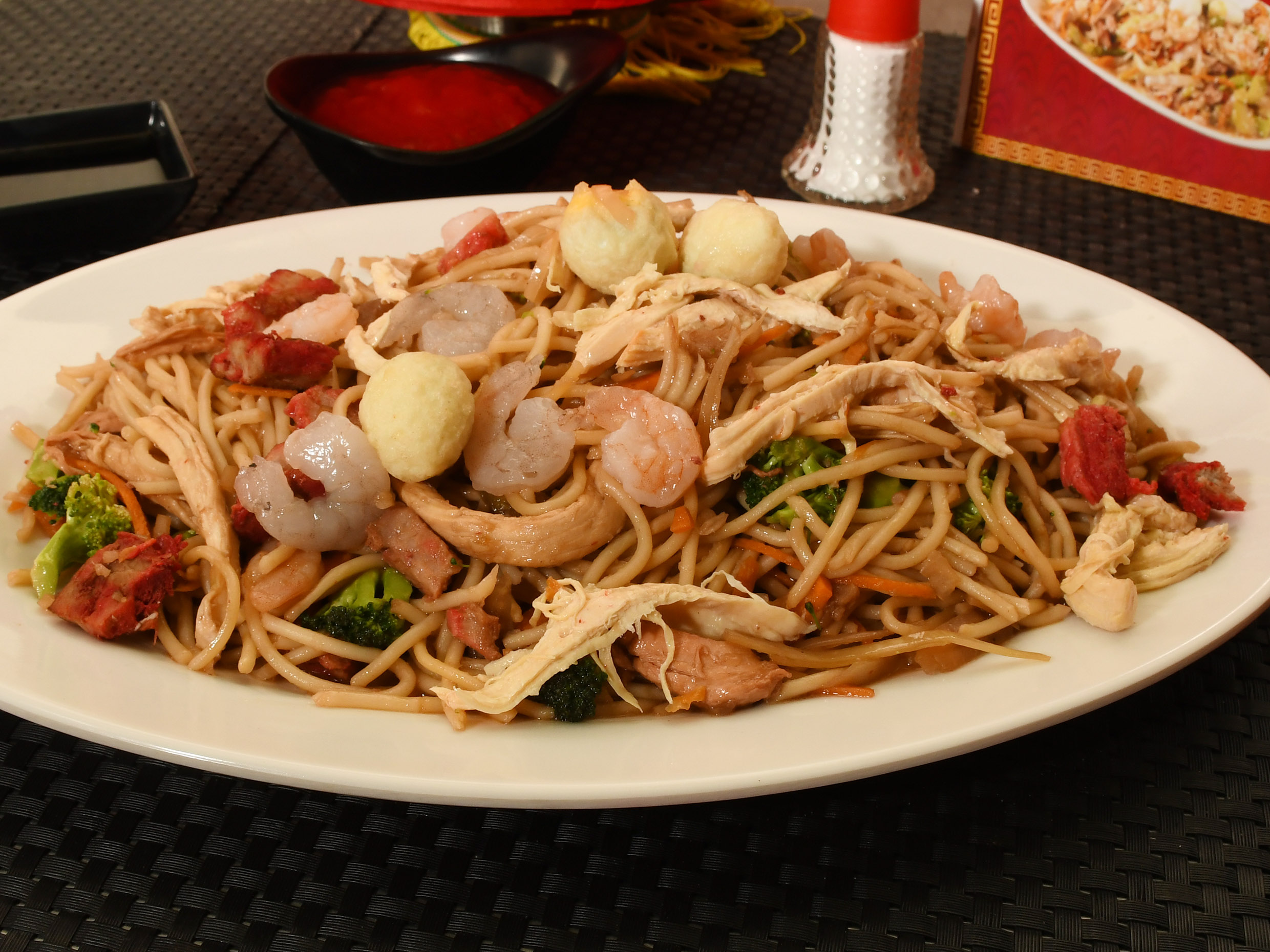 Pasta de 1000g en salsa de soya con pollo desmechado, cerdo, jamón, camarones, huevos de codorniz.
