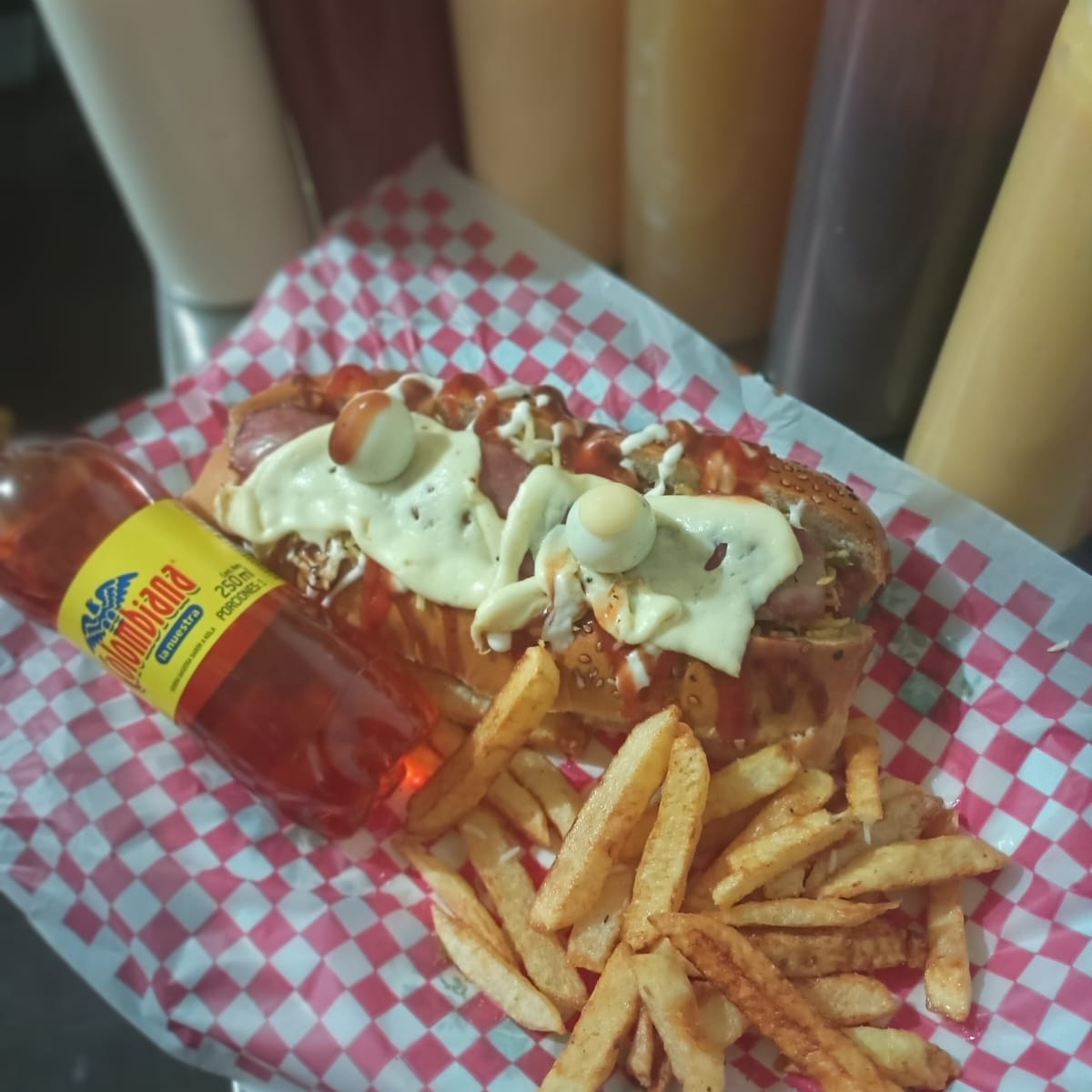 Salchicha americana, tocineta, queso gratinado, jamon papa chips, salsa, huevo de codorniz, papas francesas y gaseosa 250 ml.