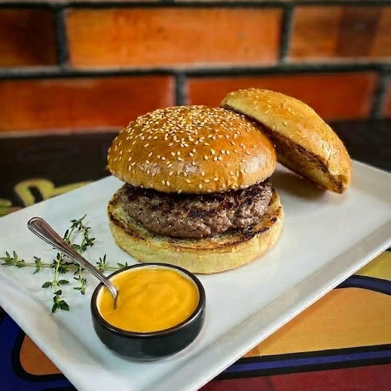 Pan tipo brioche, sellado en mantequilla con carne de res artesanal, cebolla, tomate y lechuga.