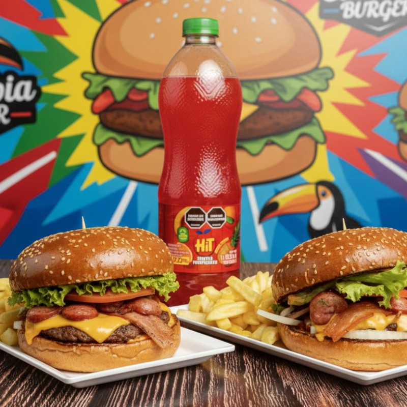 💥 ¡Pa' compartir con hambre real! 💥 🥩 2 Hamburguesas artesanales con carne 100 g full sabor 🍟 Papas crocantes a lo grande (¡papachips + francesas!) 🧃 1 litro pa' refrescar: Hit bien frío 🧂 Salsitas extra, full flow.