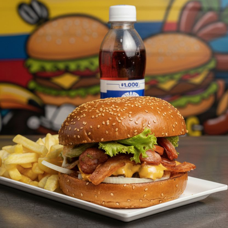 💣 El flow que no falla pa’ una buena comelona 🔥 🍔 Hamburguesa artesanal full sabor con carne 100g 🍟 Papas crocantes bien servidas 🥤 Gaseosa Postobón o Colombiana 250 ml bien fría 🧂 Incluye salsitas pa’ enchularla