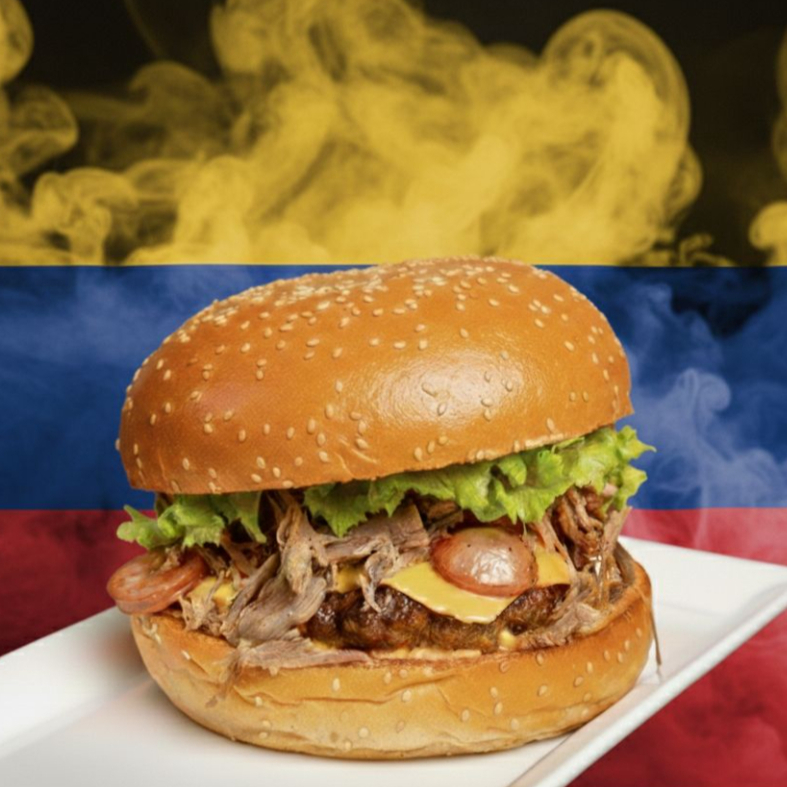 Pan brioche suave 🌟, carne de res 100% artesanal (100g) 🥩, carne desmechada al mejor estilo llanero 🤠, chorizo ahumado del llano 🐖🔥 y vegetales frescos 🍅🧅🥬. 👉 ¡Una bomba de sabor rústico y auténtico del llano colombiano! 🚀🇨🇴