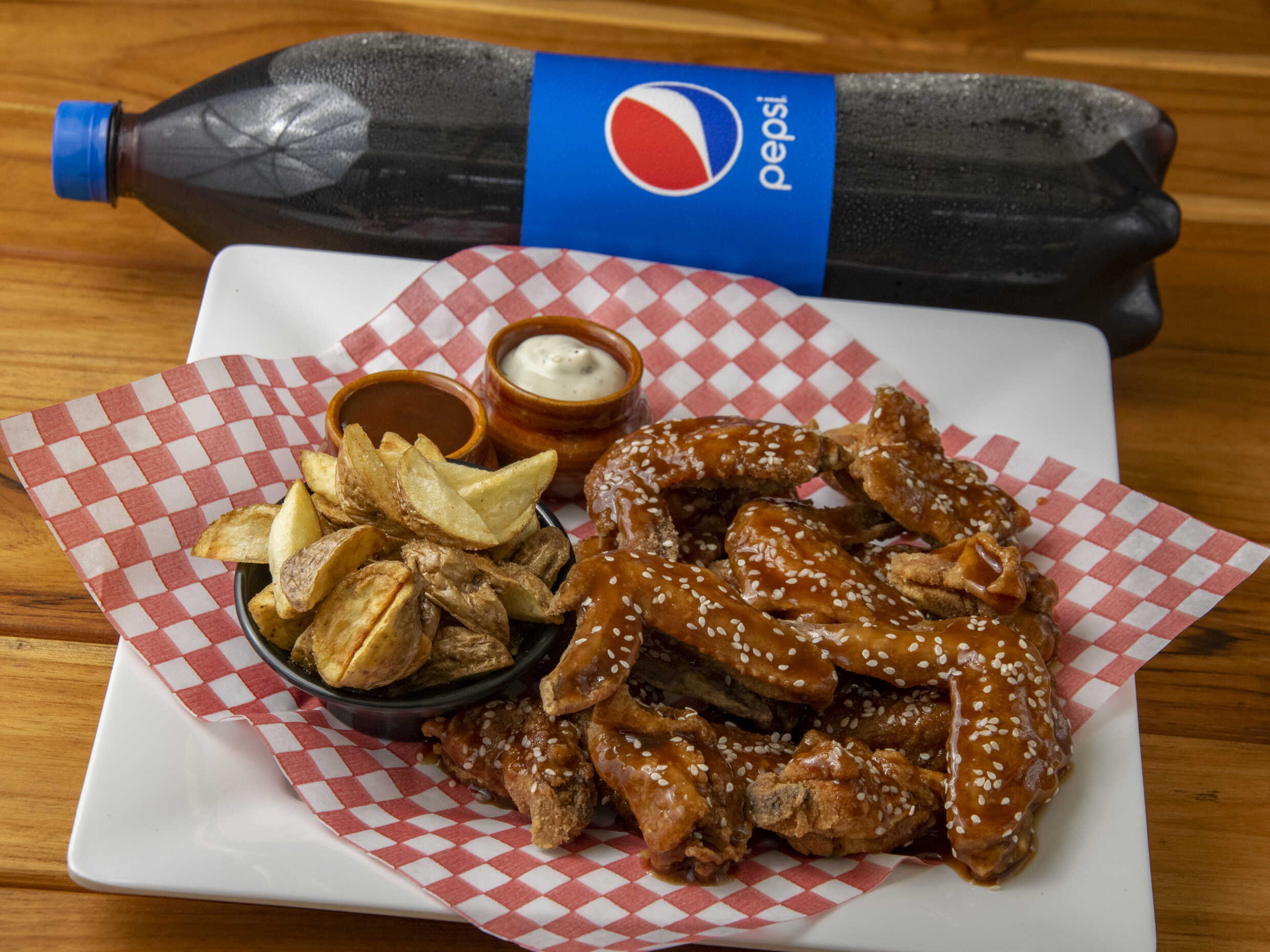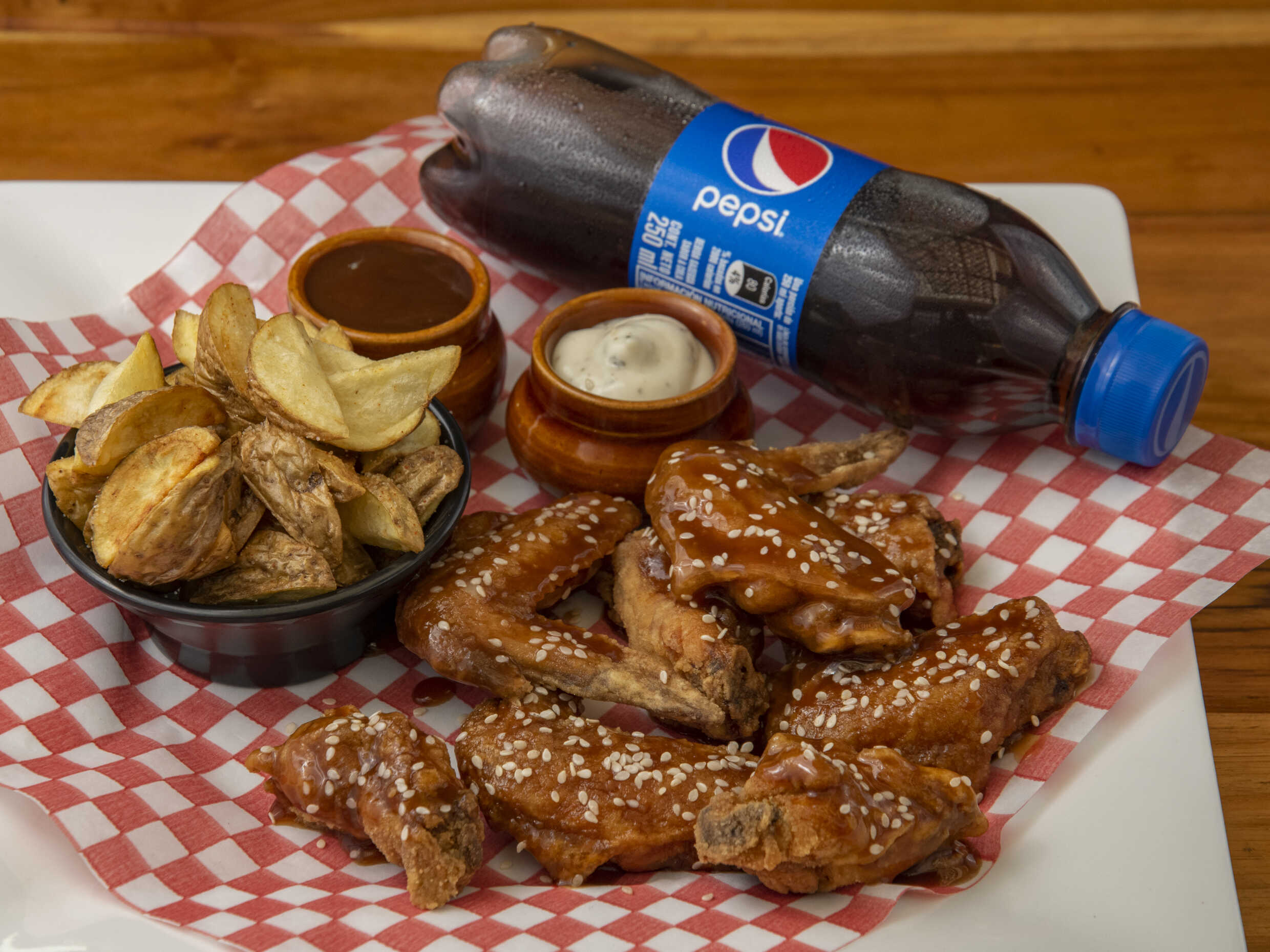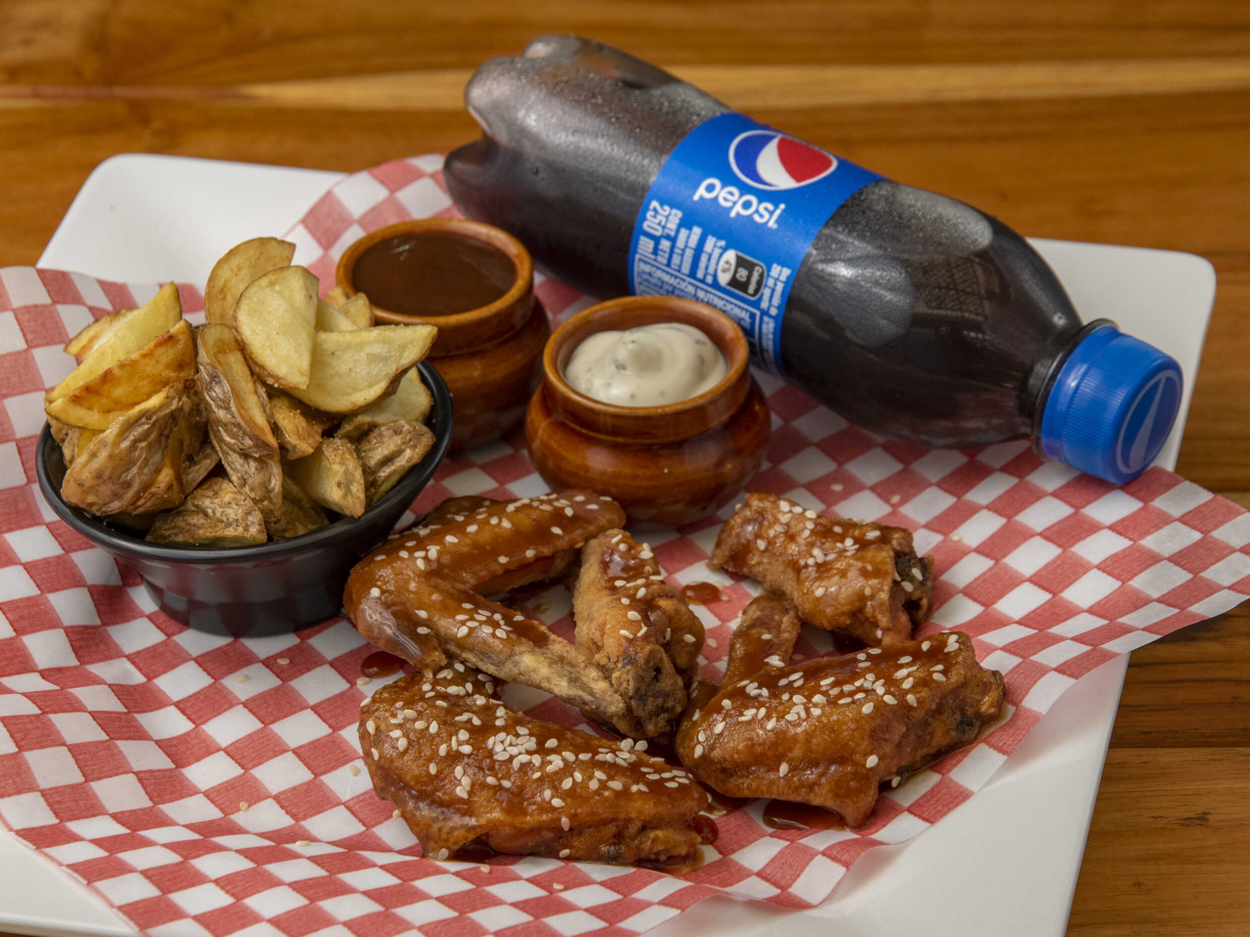 28 Deliciosas Piezas de Alitas BBQ acompañadas de una Porción de Papa a la Francesa Artesanal de 150g. + 1 Gaseosa Postobón LITRO